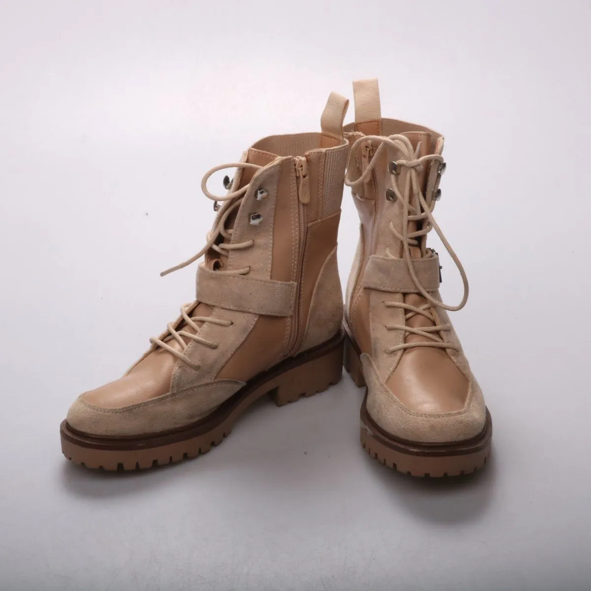 Женские ботинки DeeZee в бежевых тонах, комбинированные из гладкого материала и вставок под замшу, со шнуровкой, молнией и ремешком с пряжкой. Подойдут для повседневной носки в межсезонье и городских прогулок. Тракторная подошва даёт более уверенное сцепление на мокрой дороге.