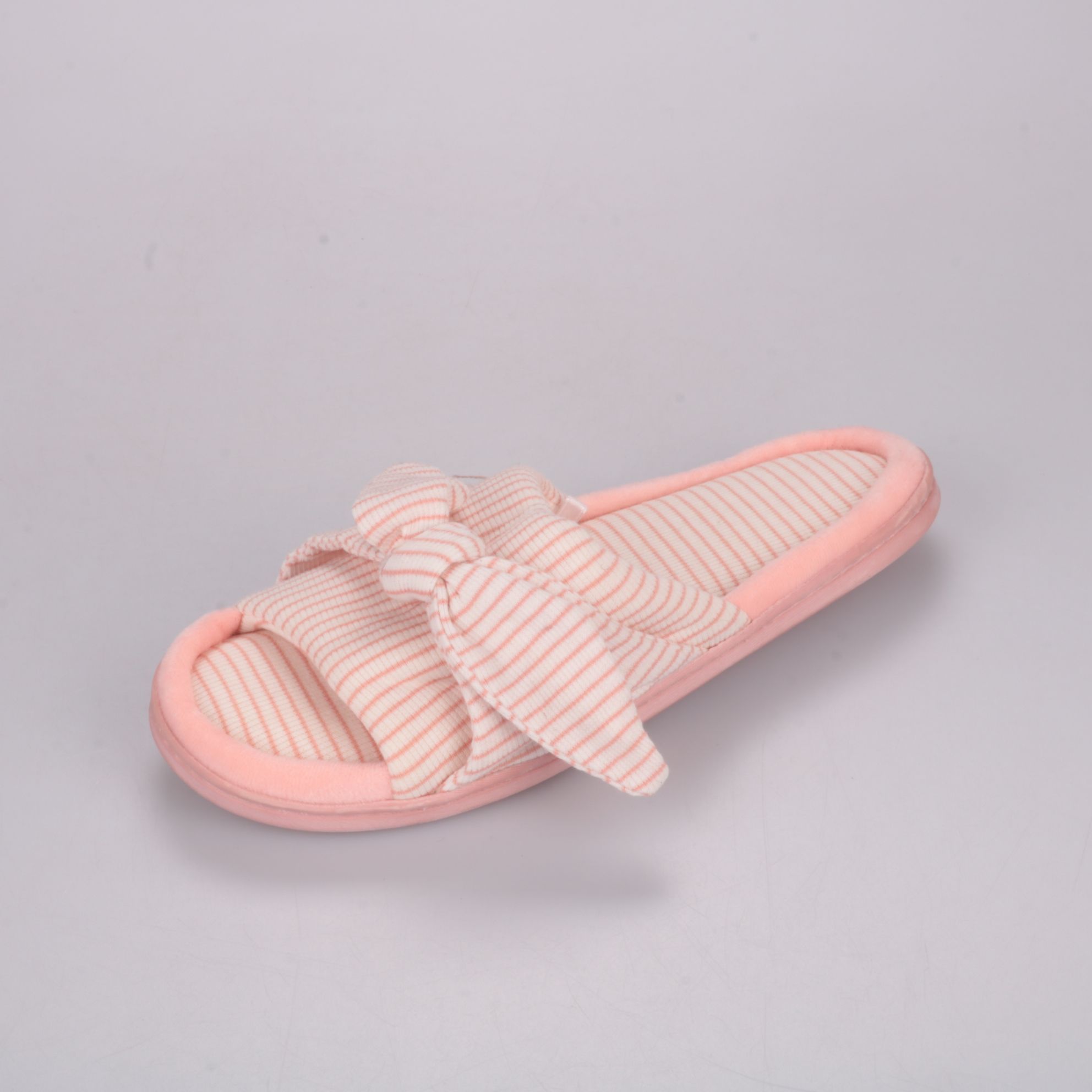 Домашние тапочки Calim & Co в нежном розовом цвете с полосатым текстилем и бантом. Подойдут для дома и отдыха, мягкая стелька делает шаг комфортнее. Лёгкие и удобные, легко надевать за счёт открытого мыска.