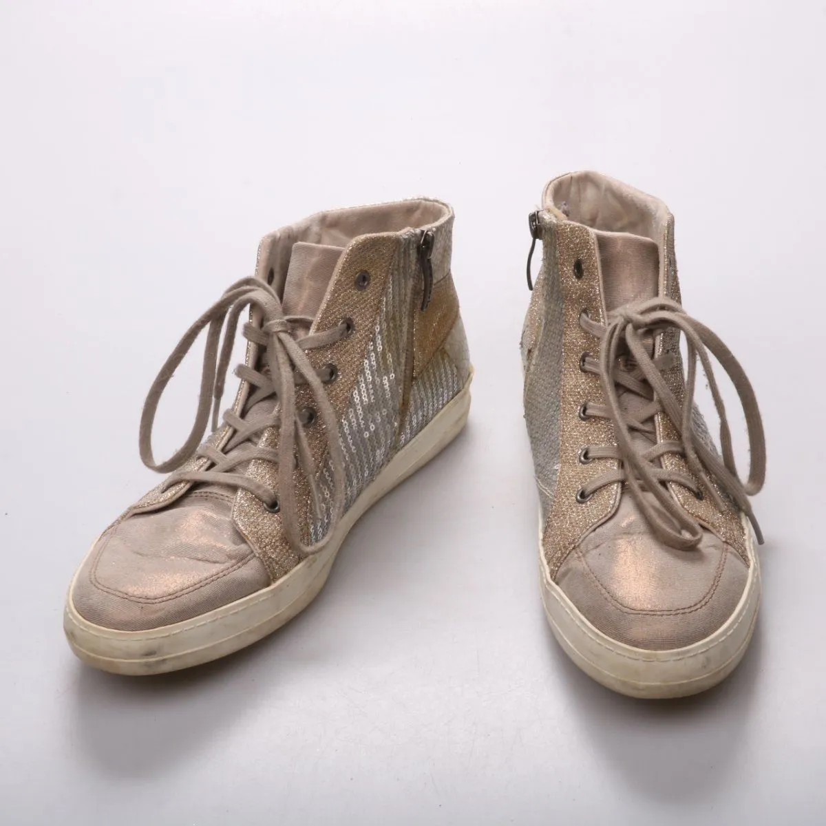 Высокие кроссовки Tamaris с декоративными пайетками и шнуровкой, дополнены боковой молнией. Подойдут для повседневных городских образов в тёплую осень/весну и прохладное лето. Молния сбоку помогает быстро надевать и снимать обувь.