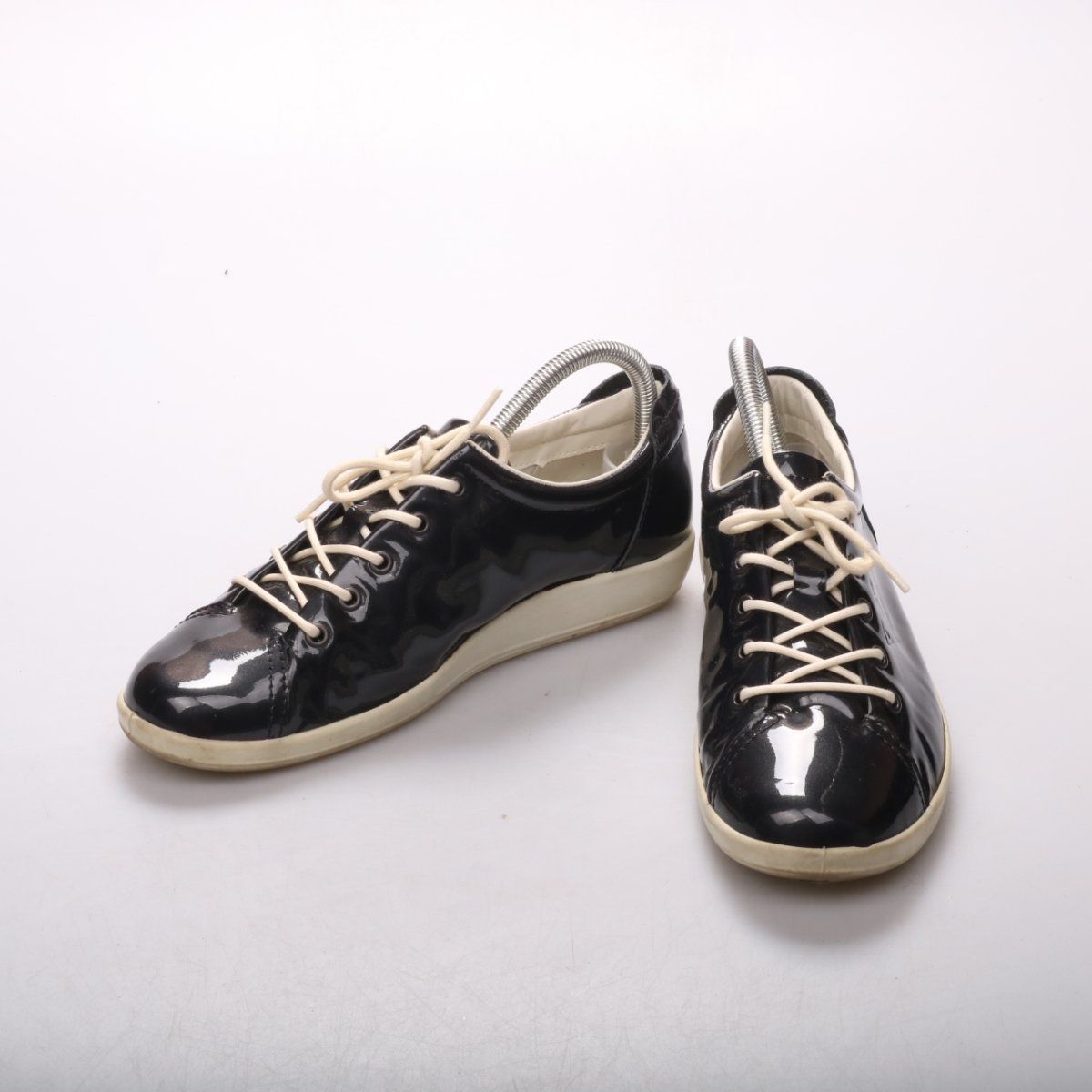Кроссовки Ecco из глянцевой (лаковой) кожи чёрного цвета на светлой резиновой подошве, со шнуровкой. Подойдут для повседневной носки в городе в демисезон и круглый год в помещении. Практичное преимущество — гладкую поверхность легко протирать и поддерживать в чистоте.