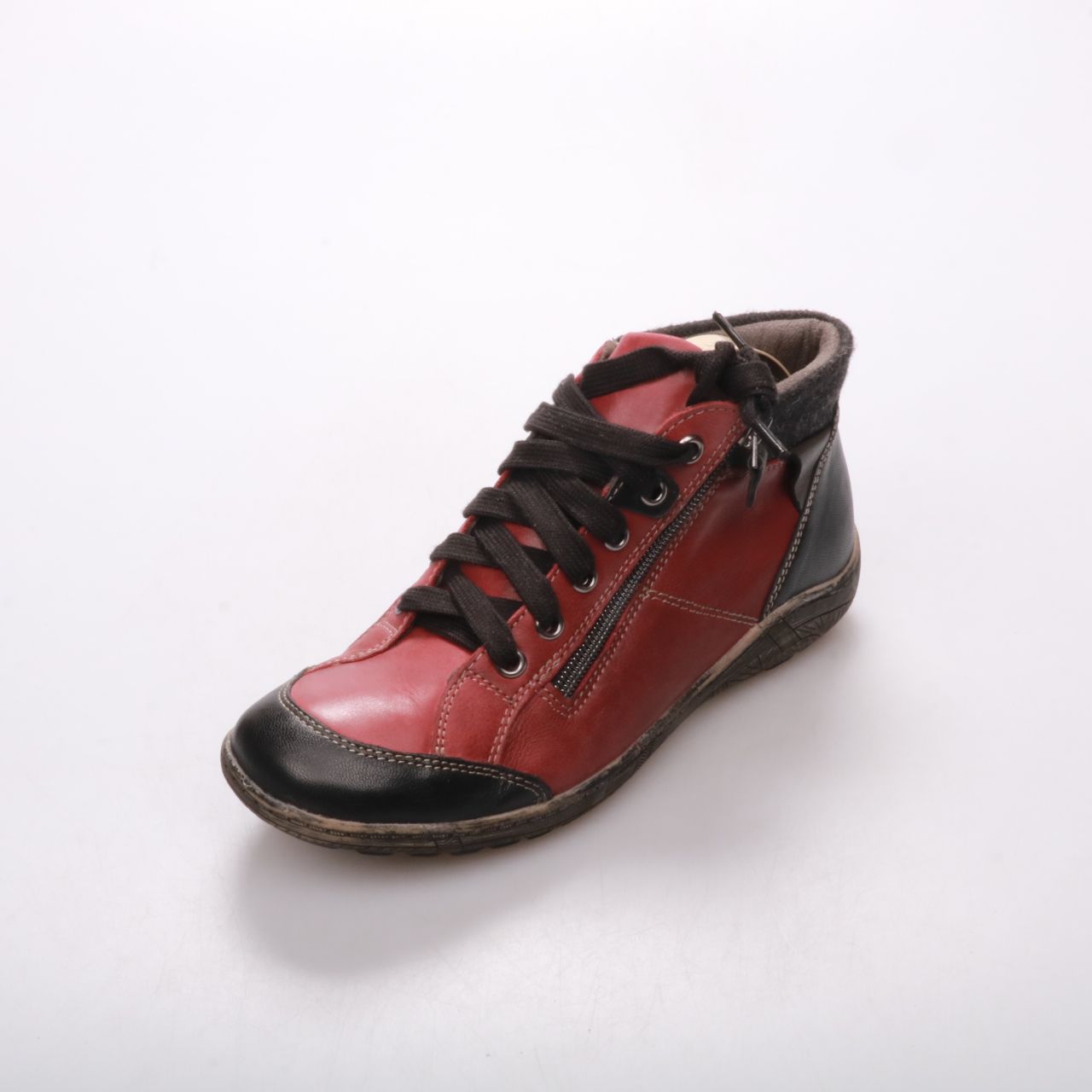 Женские кроссовки Peter Kaiser в высоком силуэте, красно-чёрные, со шнуровкой и боковой молнией. Подойдут для повседневной носки в межсезонье и прохладную погоду. Молния сбоку облегчает надевание и снятие.