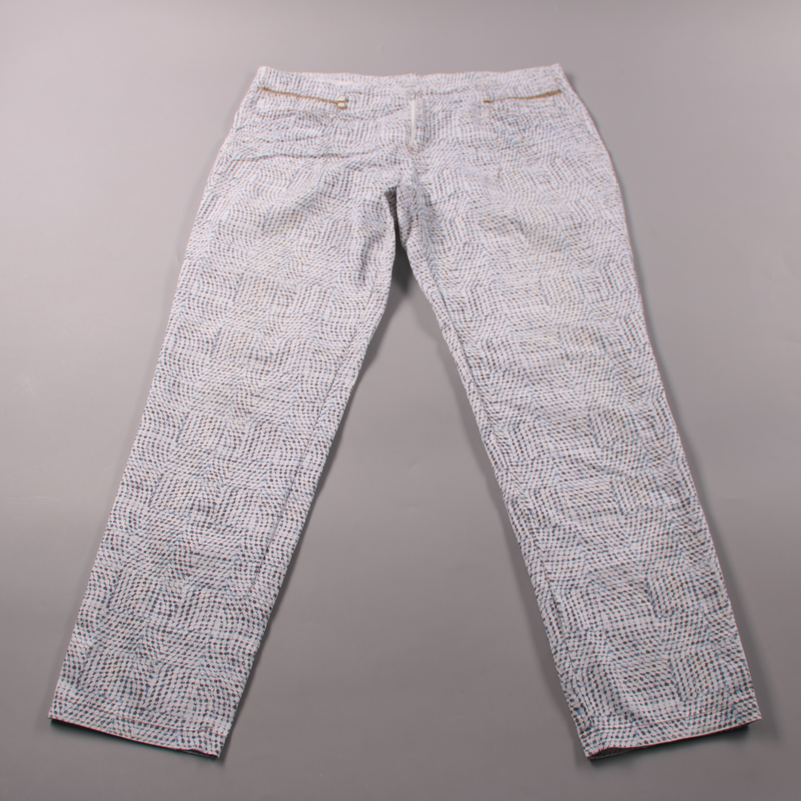 Женские брюки Paz Torras светлого цвета с мелким геометрическим принтом и застёжкой на молнию. Подойдут для летних и офисных образов, хорошо сочетаются с однотонными топами и жакетами. Практичный плюс — тонкая ткань и светлая расцветка, комфортно в тёп...