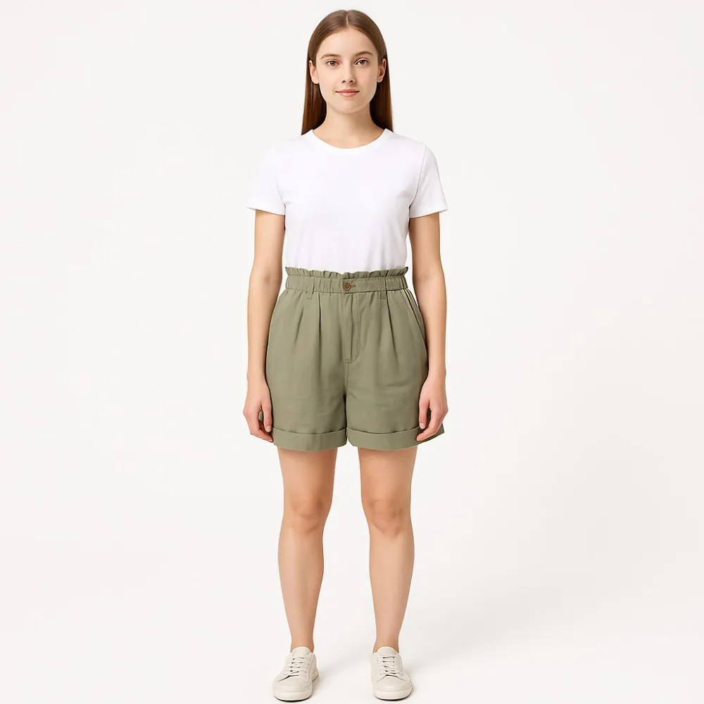 Женские шорты AMISU цвета хаки с высокой посадкой и эластичным поясом. Подойдут для лета и тёплой весны, легко сочетаются с футболками и топами. Пояс на резинке делает посадку комфортной и не сковывает движения.