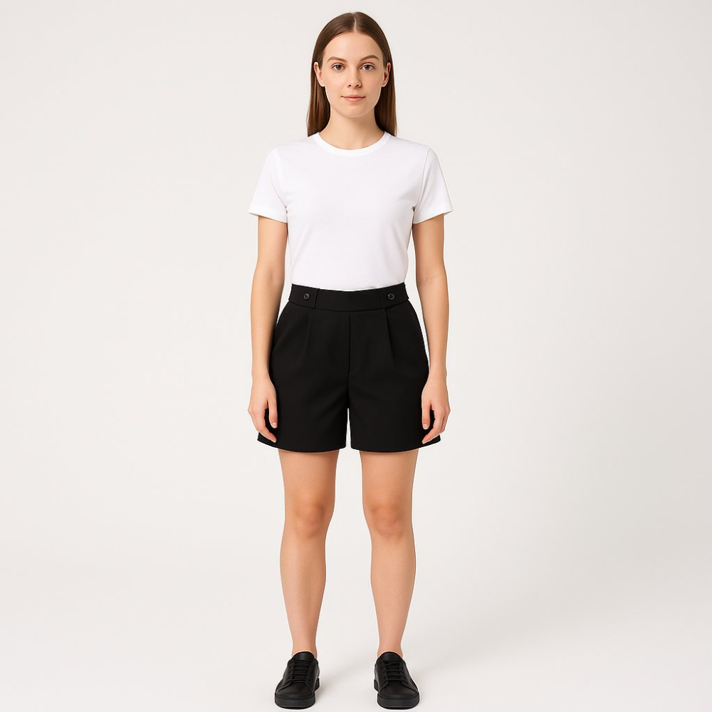 Женские шорты JDY чёрного цвета, лаконичная модель с высокой посадкой и защипами спереди. Подойдут для летних прогулок и офиса с нестрогим дресс-кодом, легко сочетаются с футболками и рубашками. Практичный плюс — плотная ткань держит форму и почти не м...