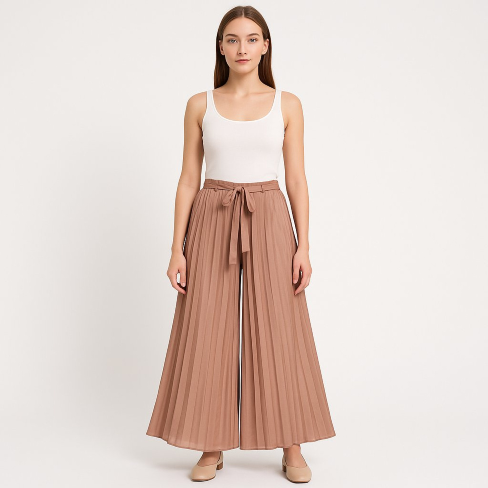 Женские брюки-палаццо Shein в бежево-пудровом оттенке с плиссировкой и поясом-лентой на талии. Подойдут для летних прогулок и офиса в сочетании с топом или блузой. Лёгкая ткань хорошо драпируется и почти не мнётся.