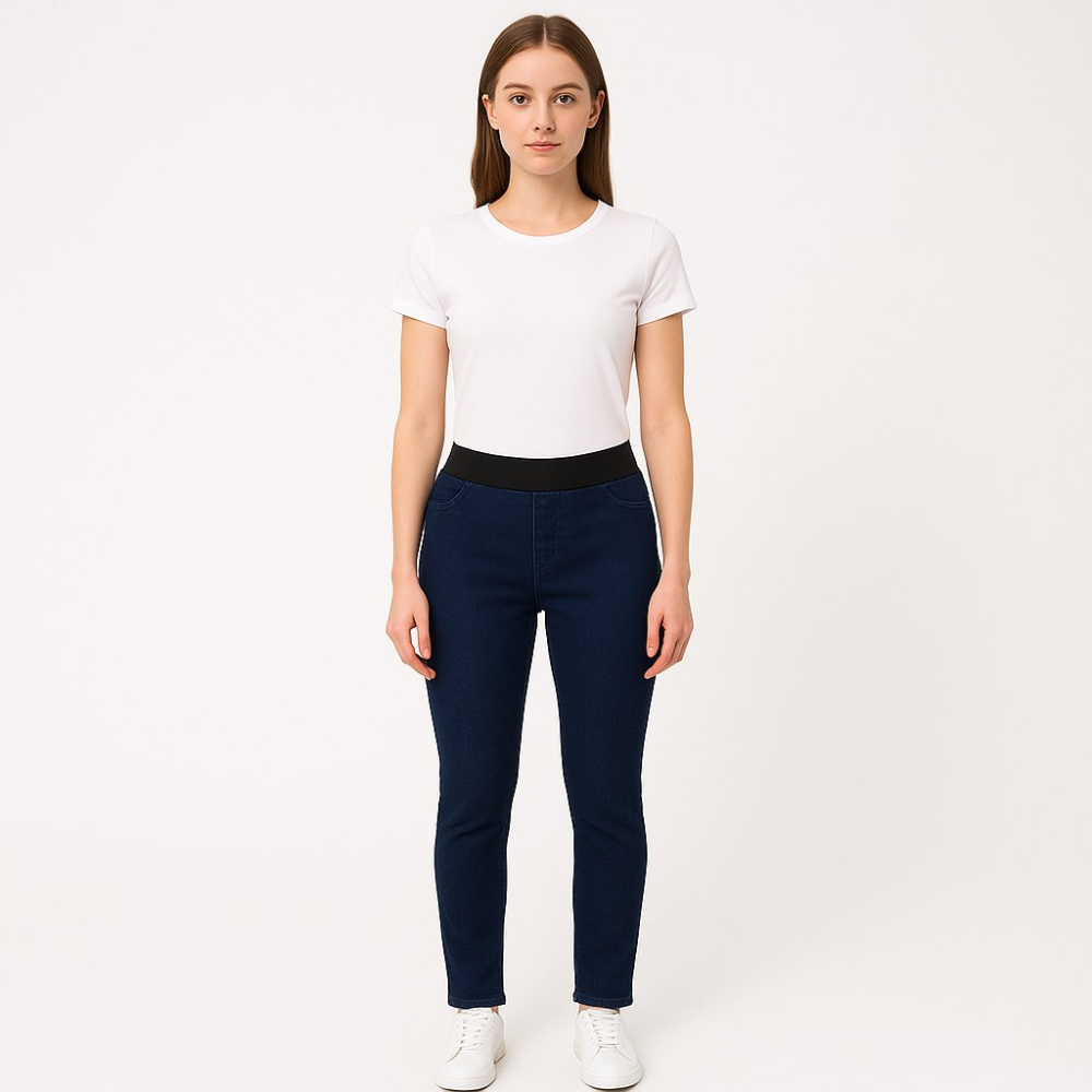 Женские зауженные брюки F&F из плотного трикотажа тёмно-синего цвета с широкой эластичной резинкой на талии. Подойдут для повседневных образов и офиса с нестрогим дресс-кодом, хорошо сочетаются с футболками и рубашками. Практичны за счёт комфортной пос...