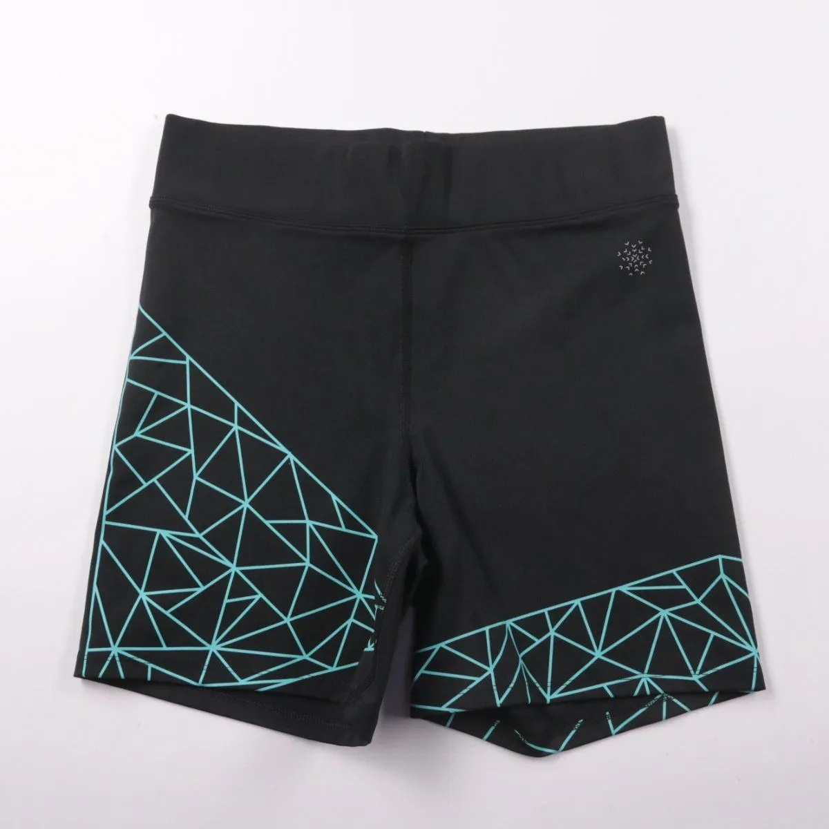 Спортивные облегающие брюки-шорты Aurique чёрного цвета с бирюзовым геометрическим принтом и широким эластичным поясом. Подойдут для тренировок, фитнеса и активных прогулок. Плотная эластичная ткань хорошо тянется и удобно садится по фигуре.