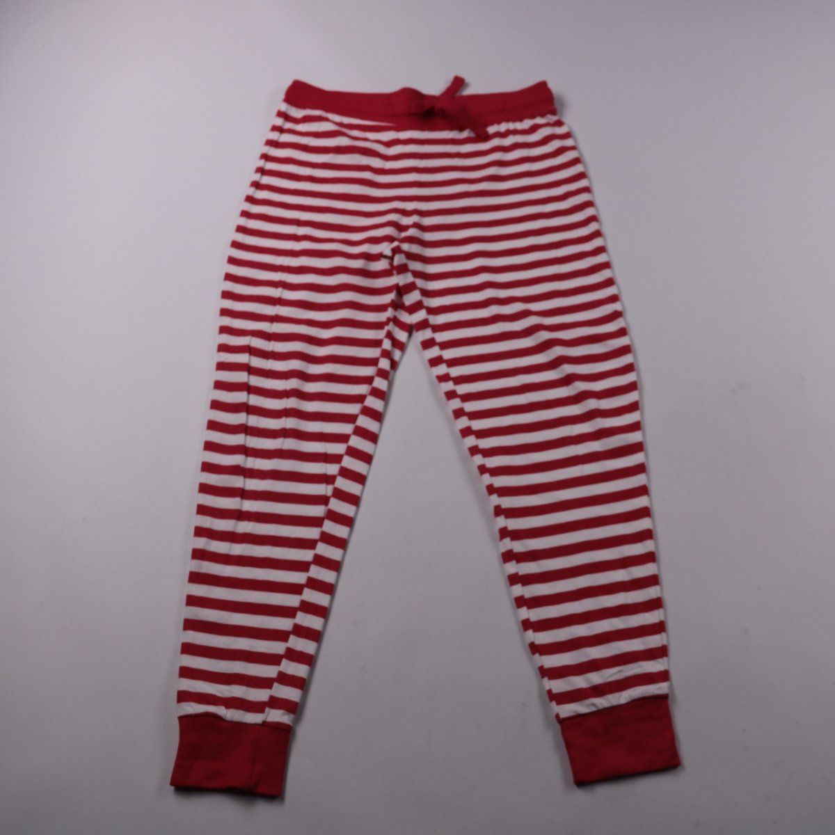 Женские брюки Threadbare из хлопкового трикотажа в красно-белую полоску, с эластичным поясом и шнурком. Подойдут для дома, сна и спокойных прогулок в тёплое время. Мягкий материал и манжеты по низу делают посадку комфортной и не дают штанинам задираться.
