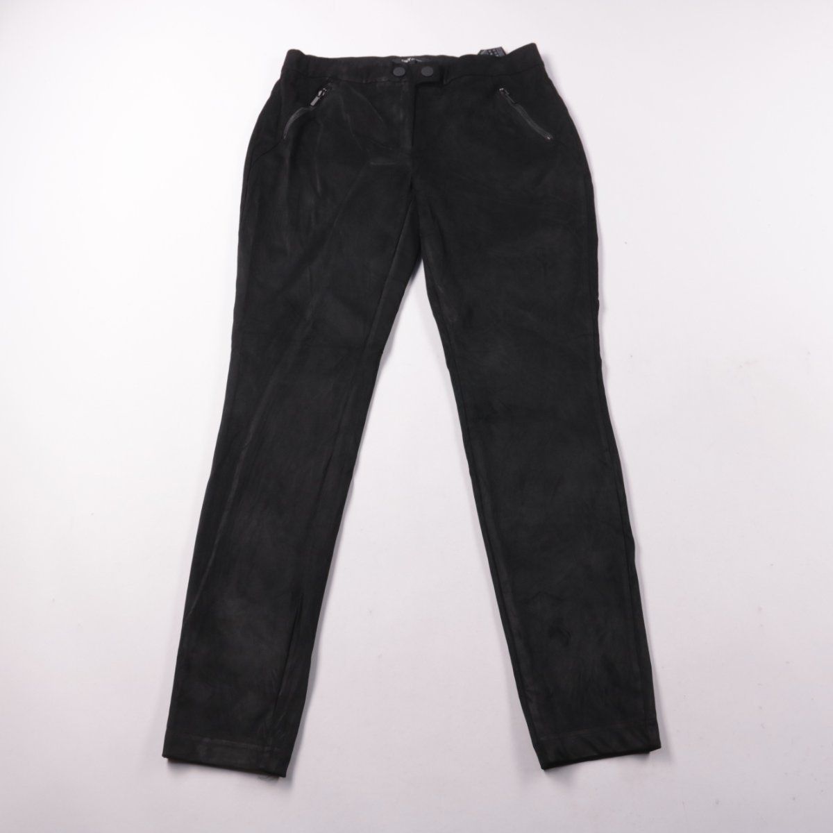 Чёрные женские брюки из плотной эластичной ткани с застёжкой на молнию и пуговицу, спереди карманы на молниях. Подойдут для повседневной носки и офиса в прохладную погоду. Материал с эластаном немного тянется и комфортнее садится по фигуре.