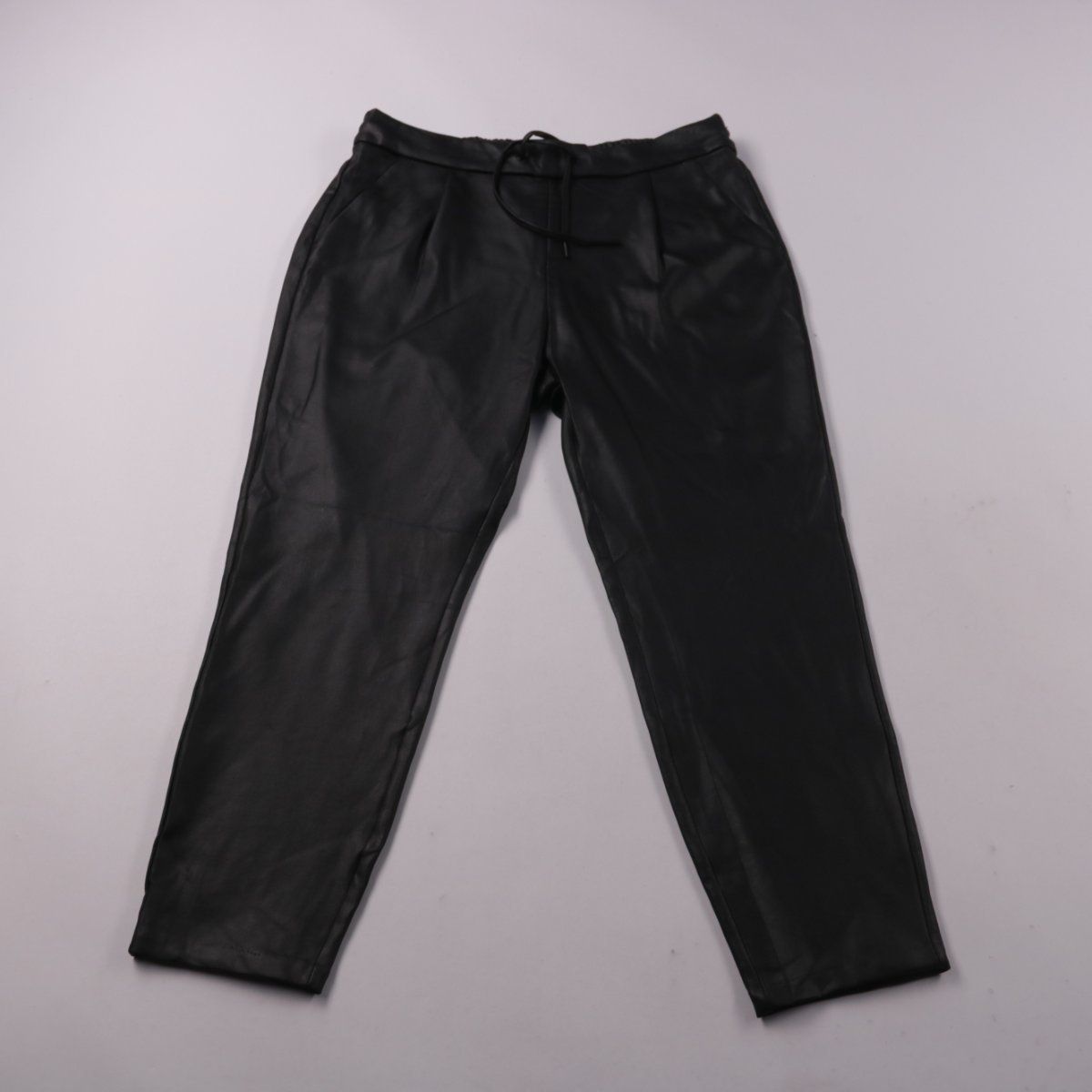 Женские брюки Vero Moda из материала под кожу, чёрного цвета, с эластичным поясом и шнурком. Подойдут для повседневных образов в прохладную погоду и на выход, хорошо сочетаются с ботинками и кроссовками. Практичный плюс — пояс на резинке комфортно садится по талии.