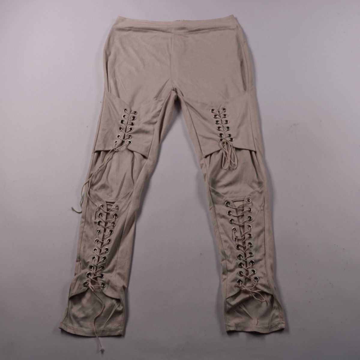 Женские облегающие брюки-легинсы бежевого цвета со шнуровкой и люверсами на штанинах. Подойдут для повседневных образов и вечеринок, хорошо сидят за счёт эластичного материала. Практичны тем, что почти не мнутся и быстро сохнут.