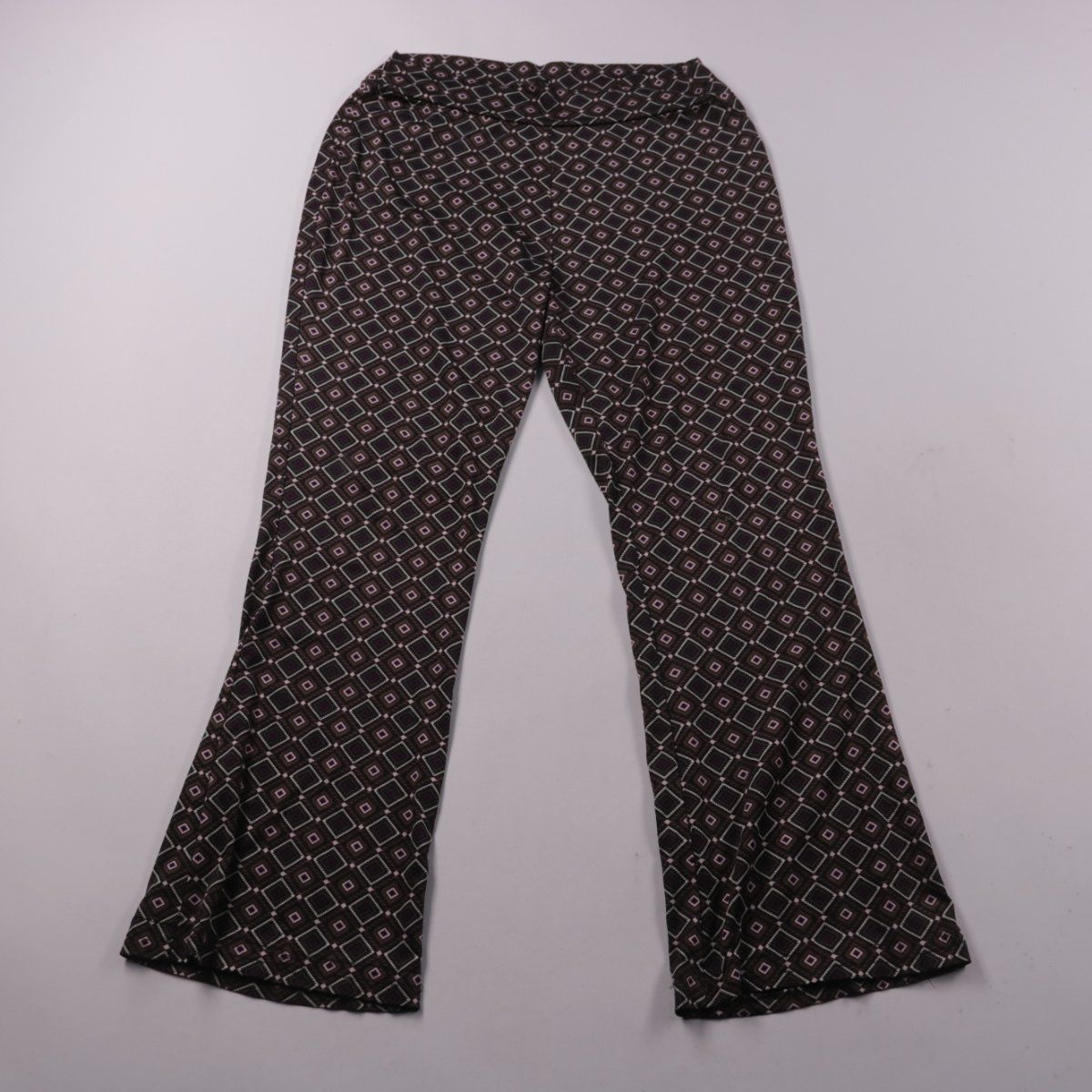 Брюки MOON с геометрическим принтом и слегка расклешёнными штанинами. Подойдут для повседневных образов и на выход, хорошо сочетаются с однотонным верхом. Практичный плюс — эластичный пояс без застёжек, удобно садится по талии.