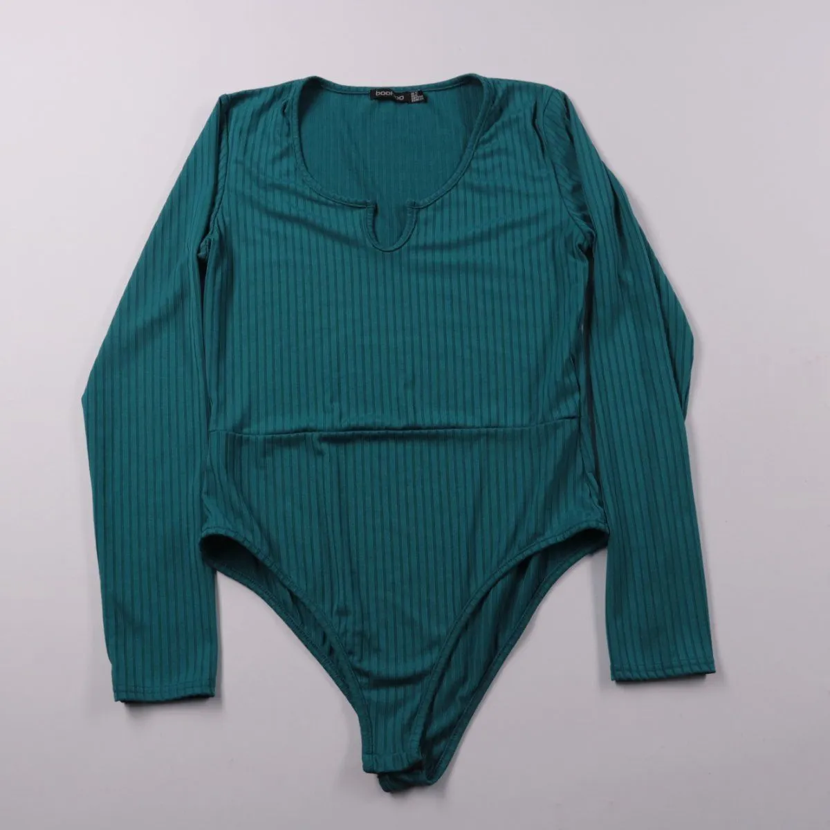 Женское боди Boohoo из фактурного трикотажа в рубчик, с длинным рукавом и округлым вырезом с небольшим разрезом спереди. Подойдёт для повседневных образов с джинсами или юбкой и как базовый слой в прохладную погоду. Плотно сидит по фигуре и удобно заправляется, не выбиваясь из одежды.