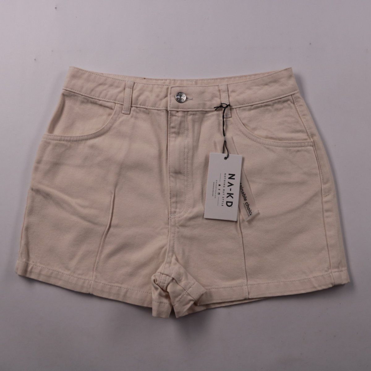 Женские шорты NA-KD бежевого цвета из плотного хлопка, с карманами и застёжкой на пуговицу. Подойдут для летних прогулок и повседневных образов с футболками и рубашками. Плотная ткань хорошо держит форму и комфортна в носке.