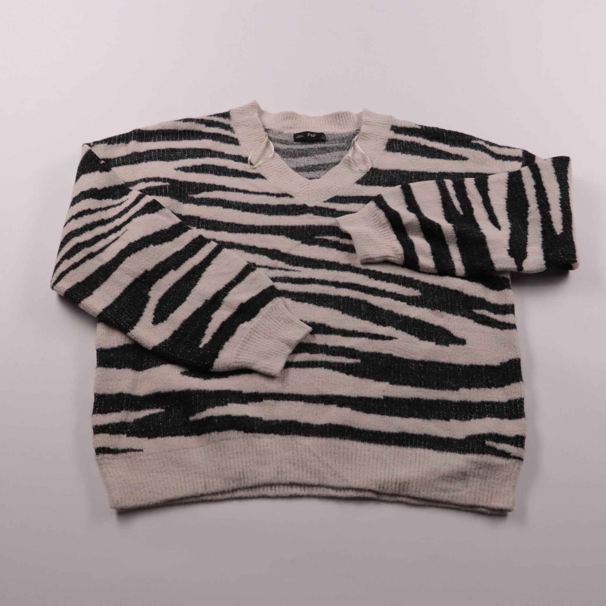 Свитер F&F с V-образным вырезом и контрастным анималистичным принтом в чёрно-бежевых тонах. Подойдёт для повседневных образов в прохладную погоду с джинсами или однотонной юбкой. Мягкий трикотаж и свободная посадка делают его удобным для носки весь день.