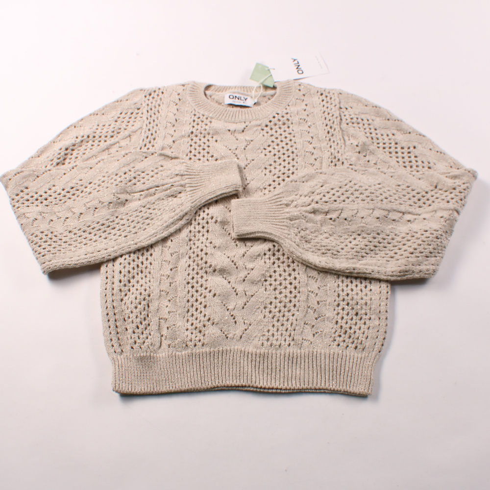 Вязаный джемпер Only в бежево-сером оттенке Feather Gray с ажурным узором и деликатным золотистым люрексом. Подойдёт для повседневных образов в прохладную погоду, хорошо сочетается с джинсами и юбками. Хлопковая основа приятна к телу и делает вещь комф...