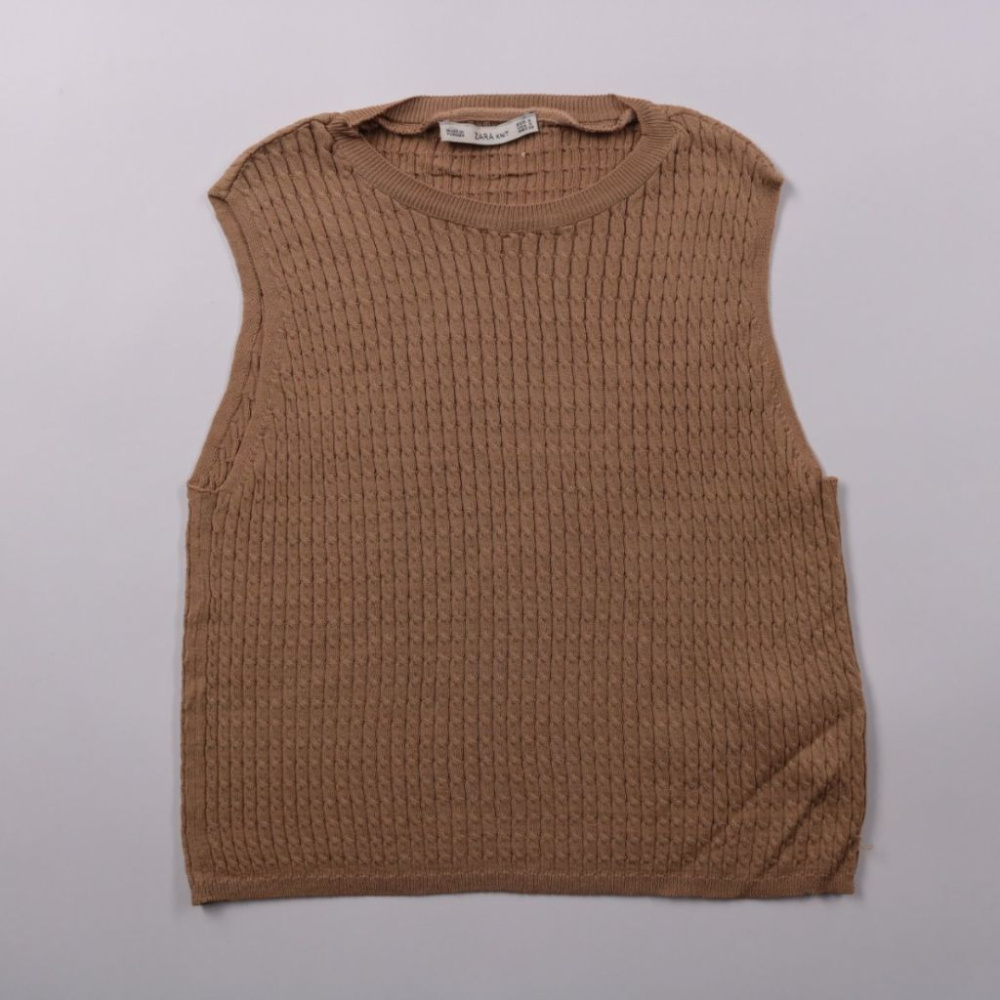 Вязаный жилет Zara Knit в бежево-коричневом оттенке с фактурной вязкой и круглым вырезом. Подойдёт для многослойных образов поверх рубашки или водолазки в офис и на каждый день. Практичен тем, что легко комбинируется с базовыми вещами и не сковывает дв...
