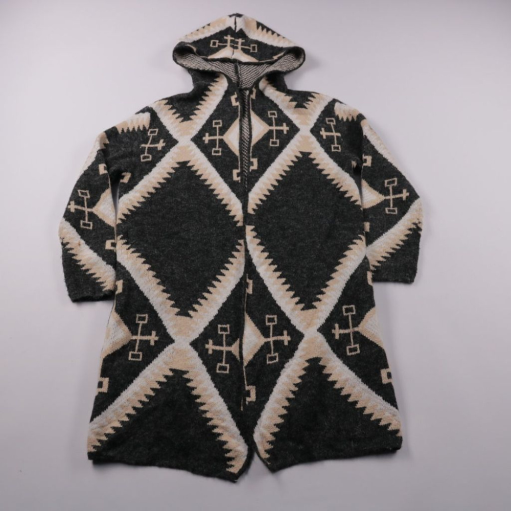Вязаный кардиган с капюшоном и геометрическим орнаментом, без указанного бренда. Подойдёт для прохладной погоды и многослойных образов на прогулки или в поездки. Практичен за счёт плотной вязки и удобной застёжки-молнии.