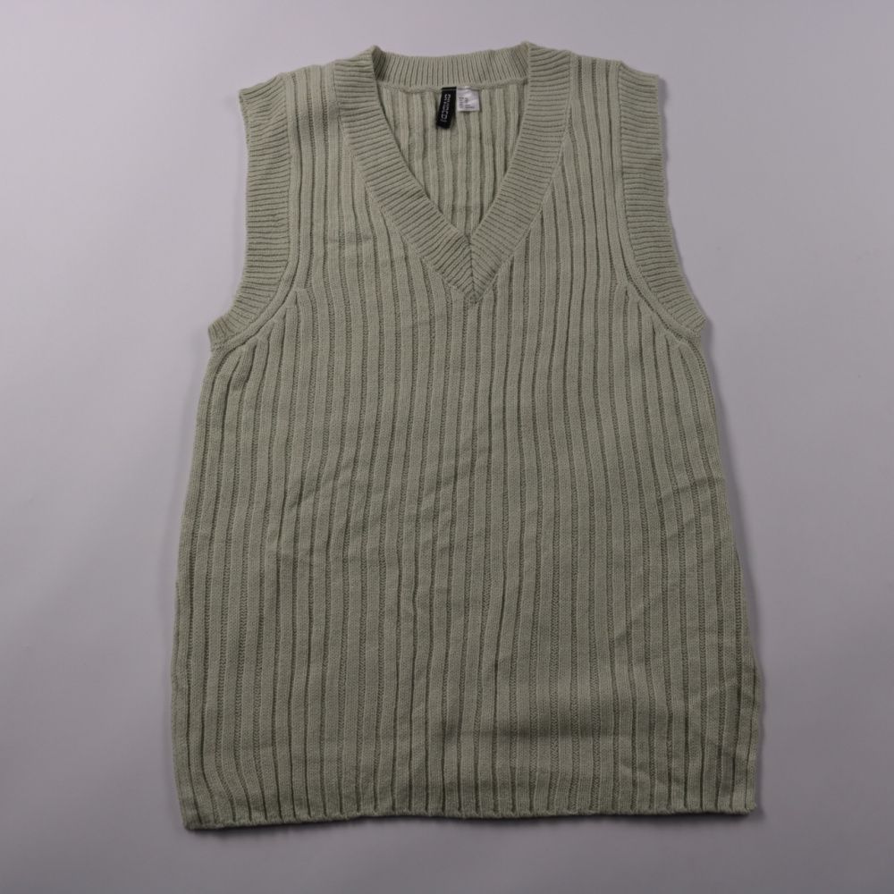 Вязаный жилет H&M в рубчик светло‑зелёного (оливкового) оттенка с V‑вырезом. Подойдёт для многослойных образов с рубашкой или водолазкой на учёбу, в офис и на каждый день. Практичен тем, что легко сочетается с базовыми вещами и не стесняет движений.