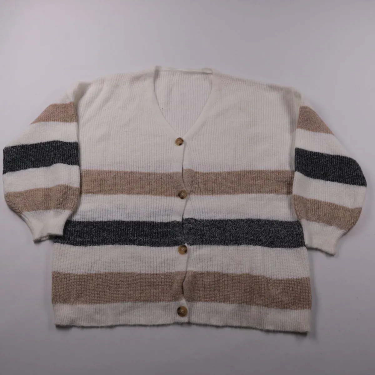 Вязаный кардиган в полоску с V-образным вырезом и застёжкой на пуговицы. Подойдёт для повседневных образов в прохладную погоду, легко сочетается с джинсами и юбками. Материал 100% нейлон — простой в уходе и быстро сохнет.