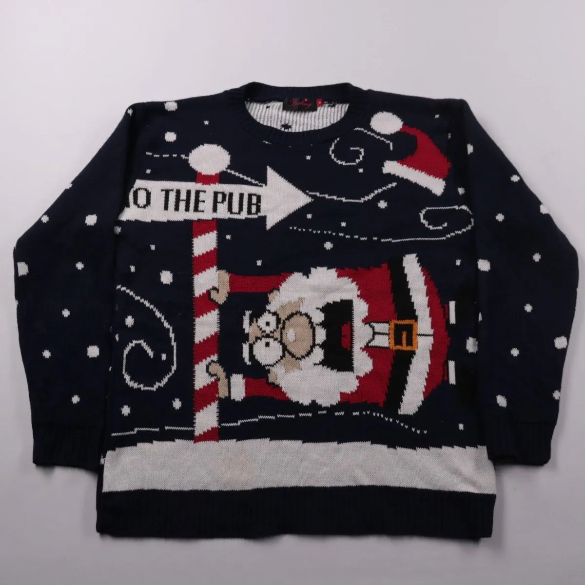 Свитер Destiny тёмно-синего цвета с новогодним жаккардовым рисунком (Санта и надпись «TO THE PUB»). Подойдёт для зимних прогулок, вечеринок и праздников. Практичный плюс — плотная вязка и удобные манжеты, хорошо держит форму при сушке на горизонтальной поверхности.