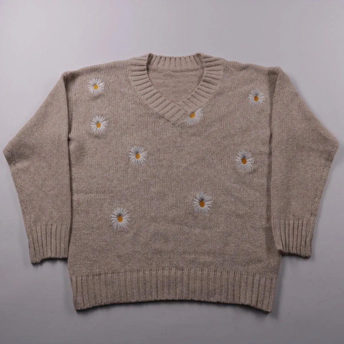 Женский трикотажный джемпер с V-образным вырезом и вышивкой ромашек по переду. Подойдёт для повседневных образов в прохладную погоду, хорошо сочетается с джинсами и юбками. Практичный синтетический состав легко стирается и быстро сохнет.