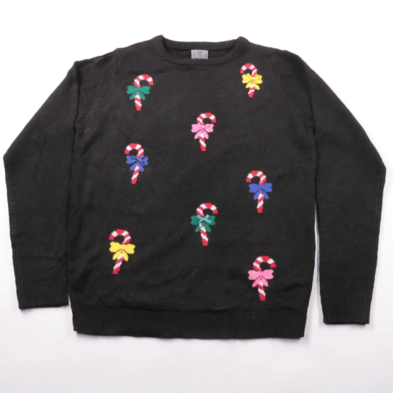 Свитер Blue Motion чёрного цвета с жаккардовым узором в виде новогодних леденцов. Подойдёт для зимних прогулок и уютных образов на каждый день. Акриловый трикотаж прост в уходе и хорошо держит форму.