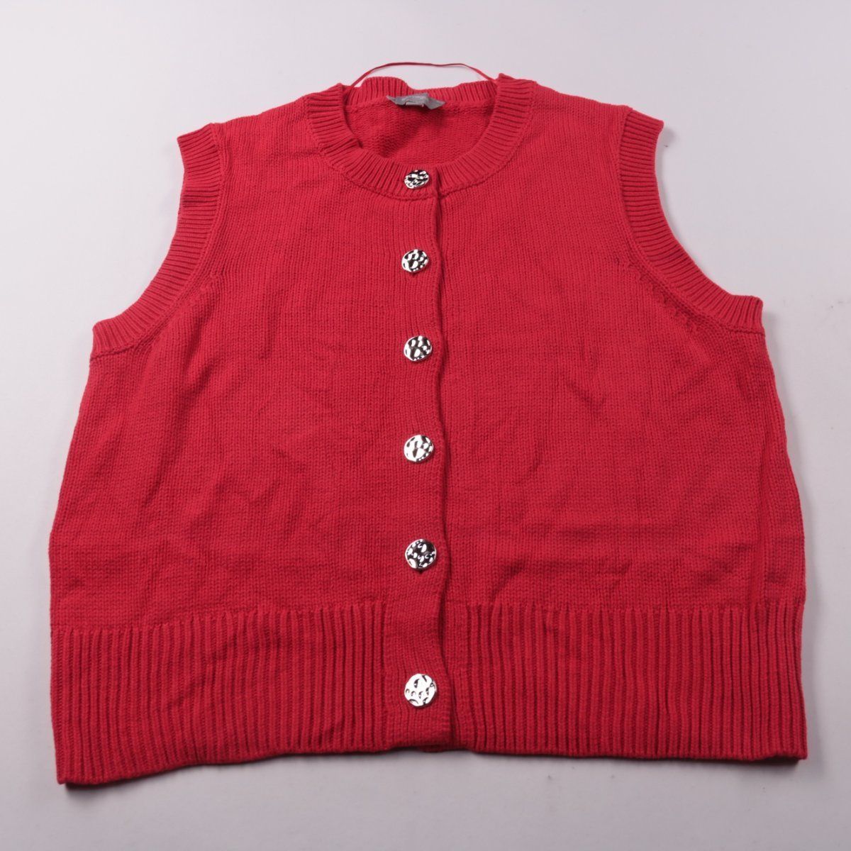 Вязаный женский кардиган-жилет Suzannegrace красного цвета, застёжка на пуговицы. Подойдёт для многослойных образов в офис или на прогулку в прохладную погоду. Смесь хлопка и акрила практична в уходе и комфортна в носке.