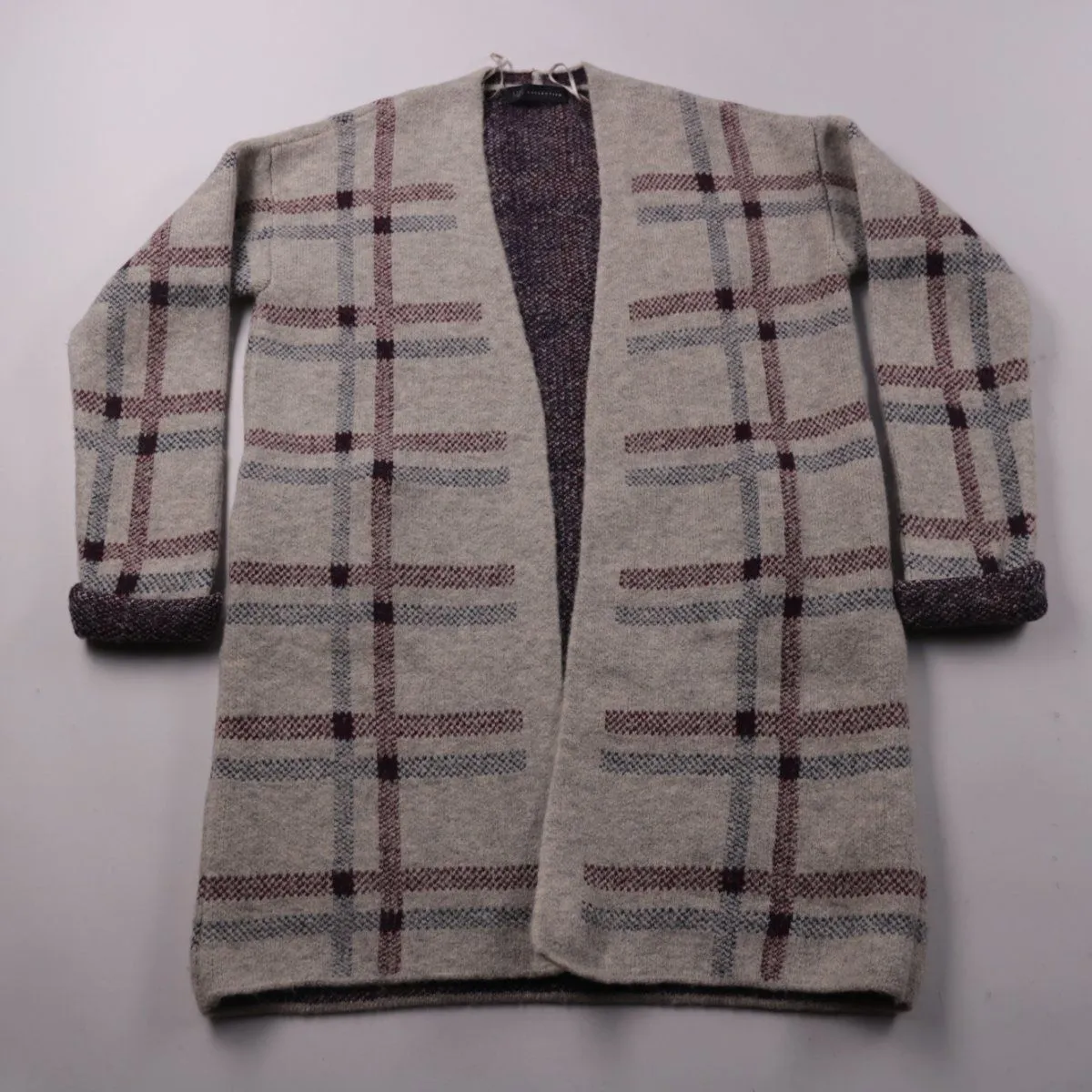 Вязаный кардиган M&S Collection серого цвета в клетку, без застёжки, с отворотами на манжетах. Подойдёт для повседневных образов в прохладную погоду и как второй слой в офис. Мягкая пряжа с добавлением эластана лучше держит форму и комфортна в носке.