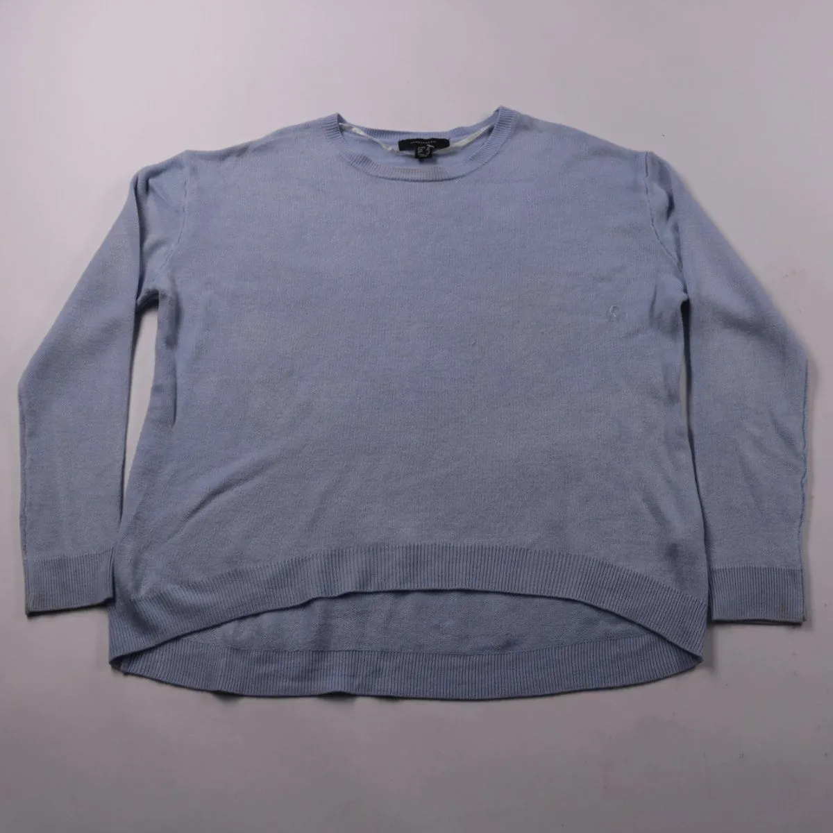 Женский трикотажный джемпер Atmosphere голубого цвета с круглым вырезом и длинным рукавом. Подойдёт для повседневной носки и офиса в прохладную погоду, хорошо сочетается с джинсами и юбками. Лёгкий трикотаж удобно носить слоями под куртку или пальто.