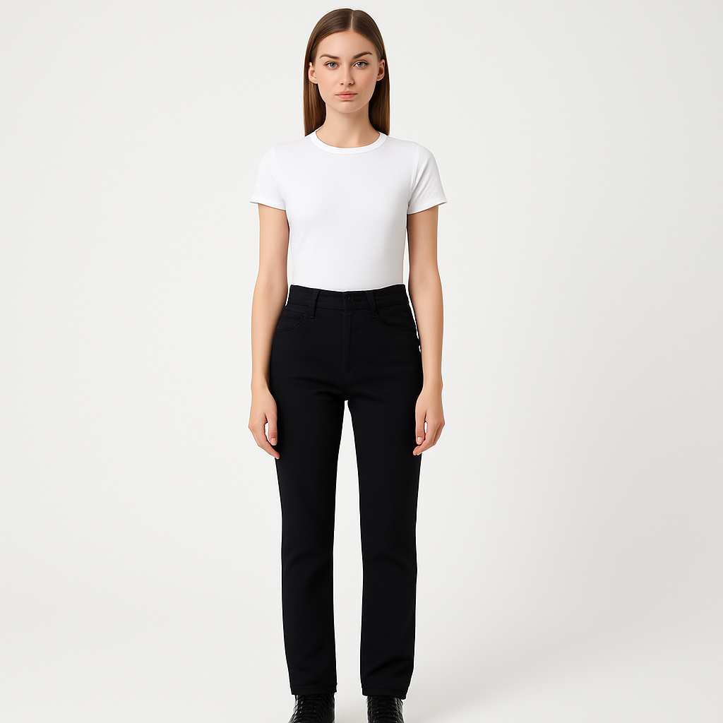 Женские чёрные джинсы SH Ease из плотного денима с высокой посадкой и прямыми штанинами. Подойдут для повседневных образов и в офис с базовыми футболками и рубашками. Плотная ткань хорошо держит форму и выглядит аккуратно.