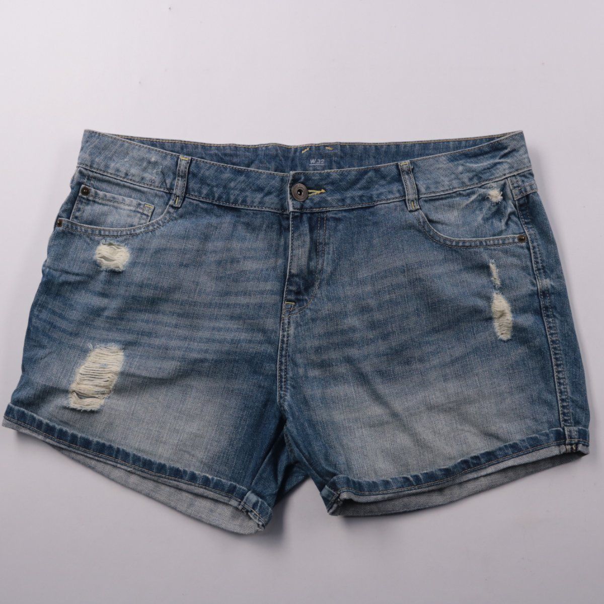 Джинсовые женские шорты из денима голубого цвета с эффектом потертостей и декоративными разрывами. Подойдут для летних прогулок и повседневных образов с футболками и кедами. Плотный материал хорошо держит форму и рассчитан на частую носку.
