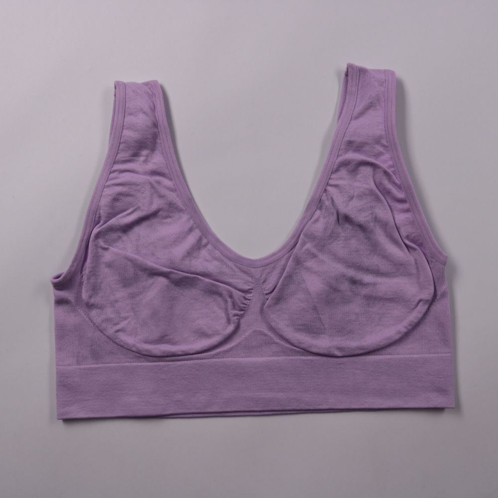 Бесшовный бюстгальтер-топ фиолетового цвета с широкими бретелями и мягкой поддержкой груди. Подойдёт для повседневной носки и дома, а также как базовый слой под одежду. Эластичный материал хорошо тянется и комфортно сидит без косточек.