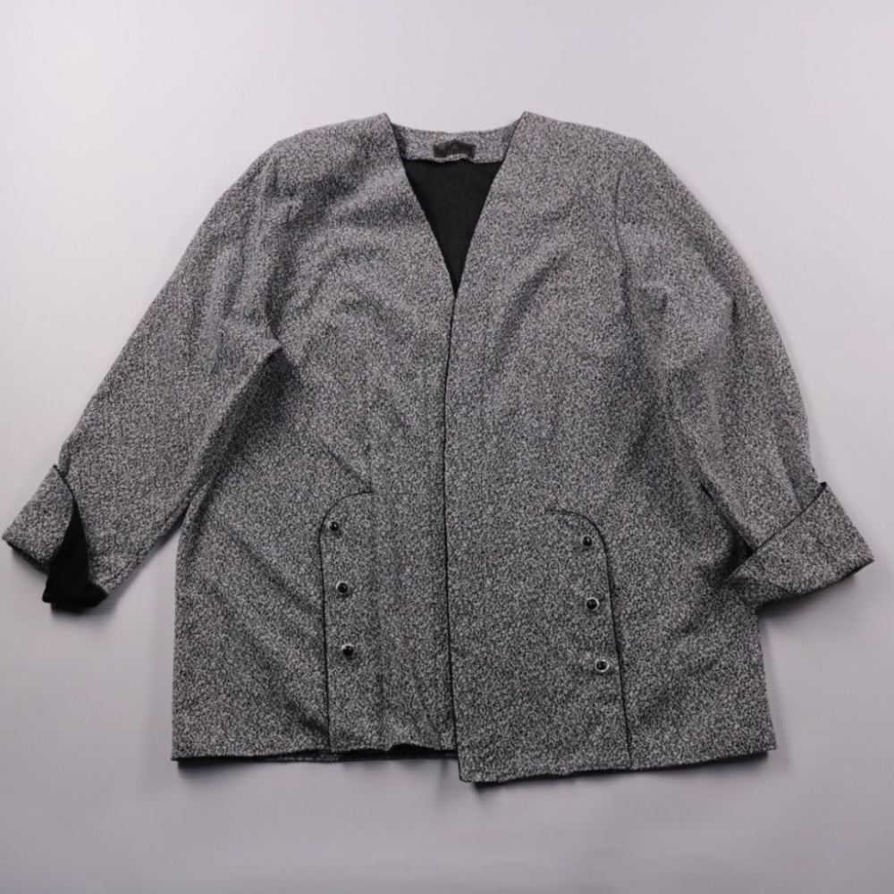 Женский пиджак без бренда, серого меланжевого цвета, с V-образным вырезом и декором на карманах. Подойдёт для офиса и повседневных образов с джинсами или брюками. Практичен тем, что легко сочетается с базовыми вещами и не требует сложного ухода.