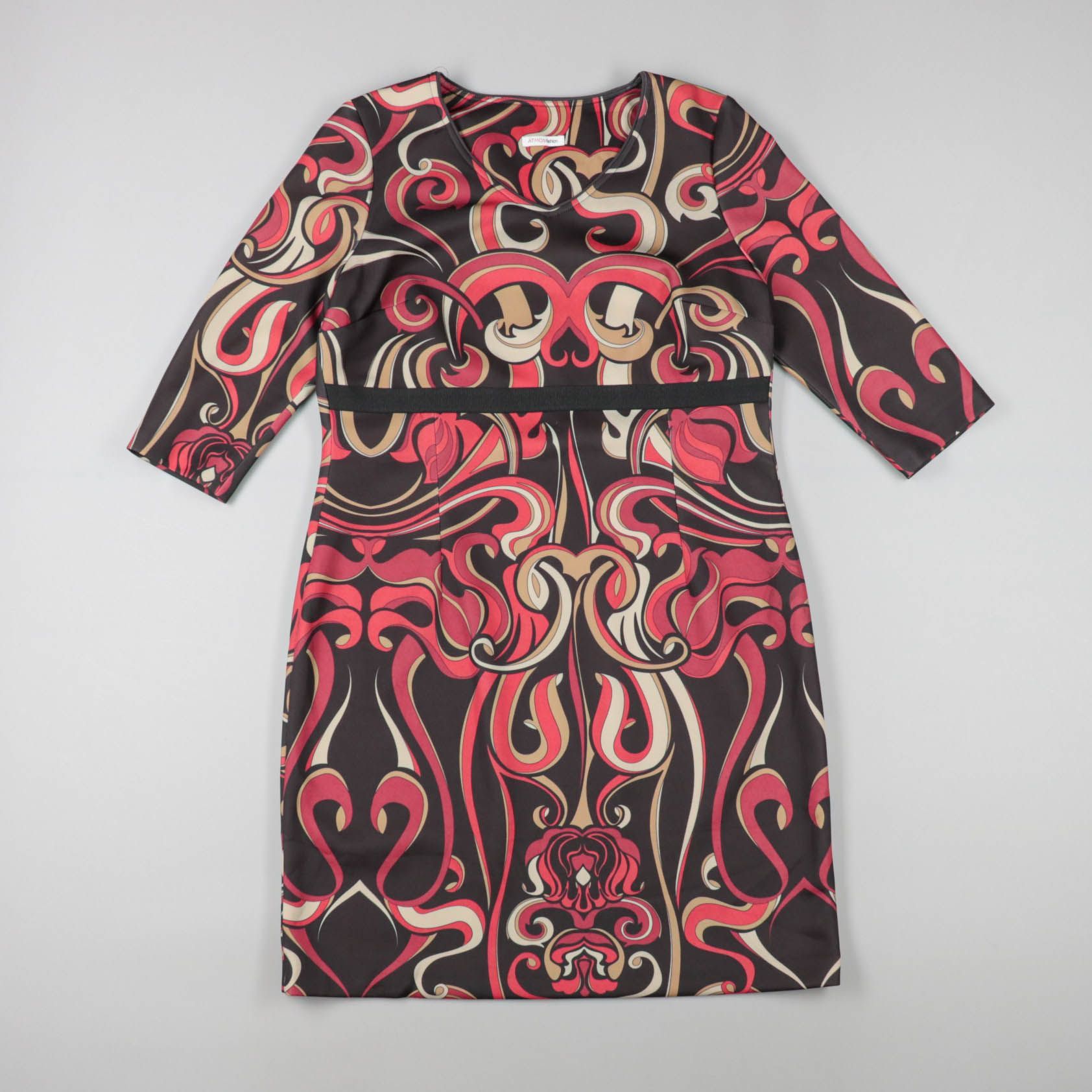 Женское платье прямого кроя с рукавом 3/4 и ярким орнаментальным принтом. Подойдёт для офиса или повседневных выходов, хорошо сочетается с однотонными туфлями/ботильонами. Практичная деталь — контрастная вставка на талии визуально формирует силуэт.