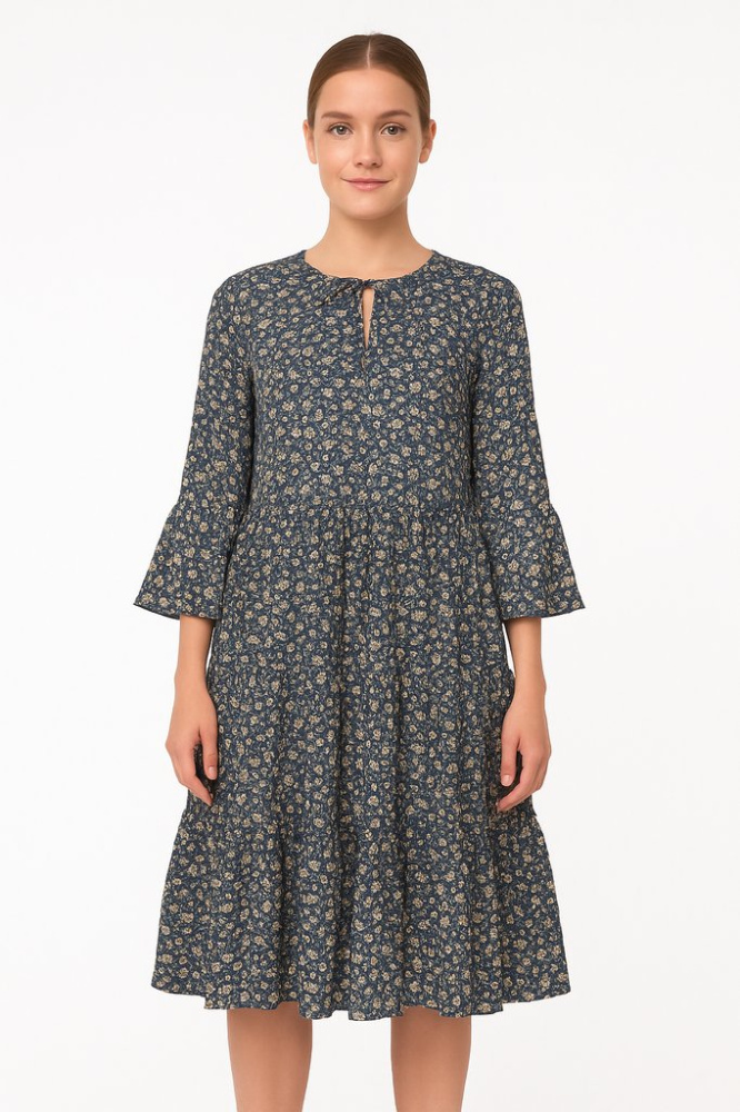 Повседневное платье Pigalle тёмно-синего цвета с мелким цветочным принтом и рукавами 3/4. Подойдёт для офиса и прогулок в тёплую весну/осень, хорошо смотрится с ботильонами или балетками. Лёгкая ткань и свободный крой не сковывают движения и комфортны ...