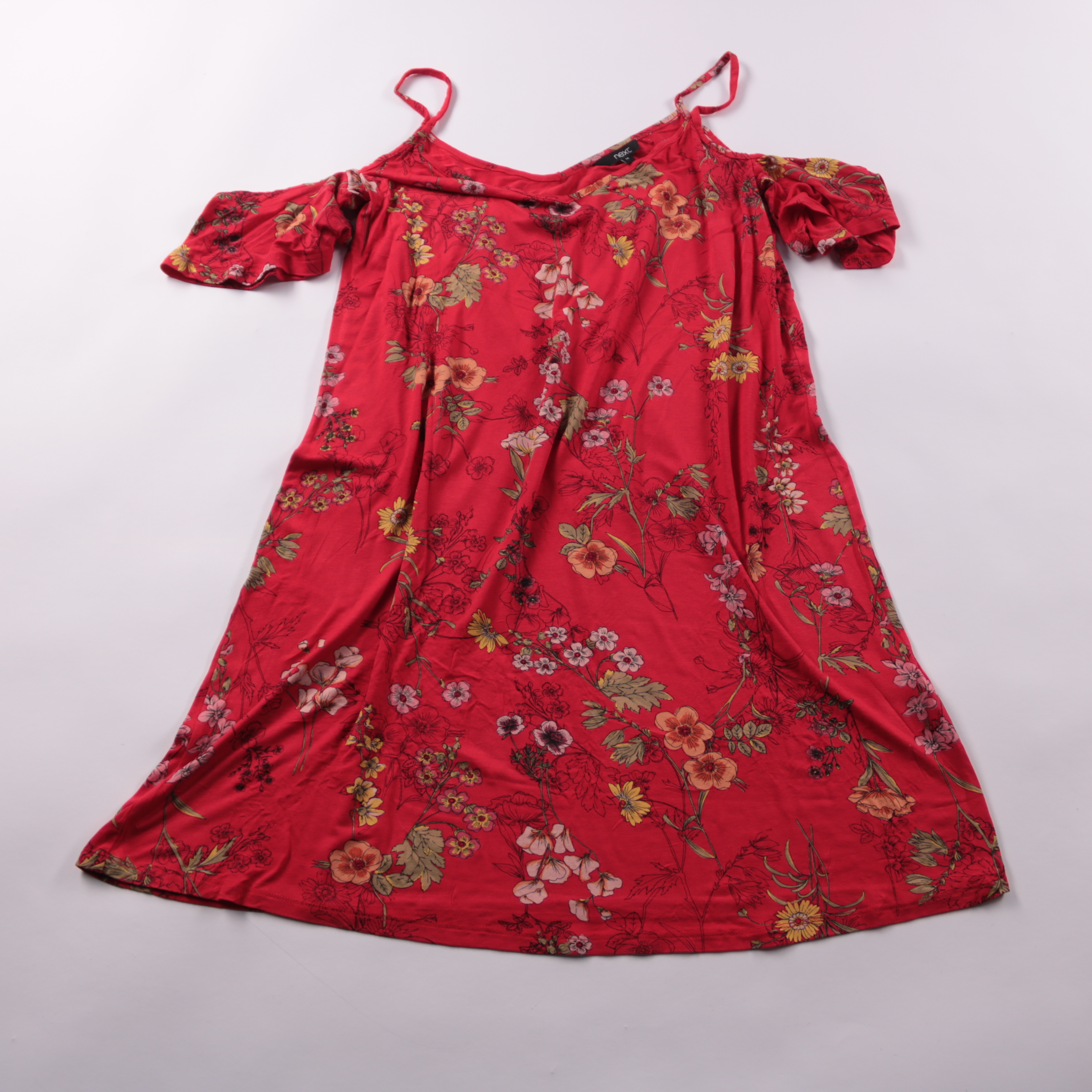 Летнее платье Next красного цвета с цветочным принтом и открытыми плечами на тонких бретелях. Подойдёт для прогулок и отдыха в тёплую погоду, легко сочетается с сандалиями или кедами. Ткань мягкая и хорошо тянется, поэтому комфортно сидит и не сковывае...