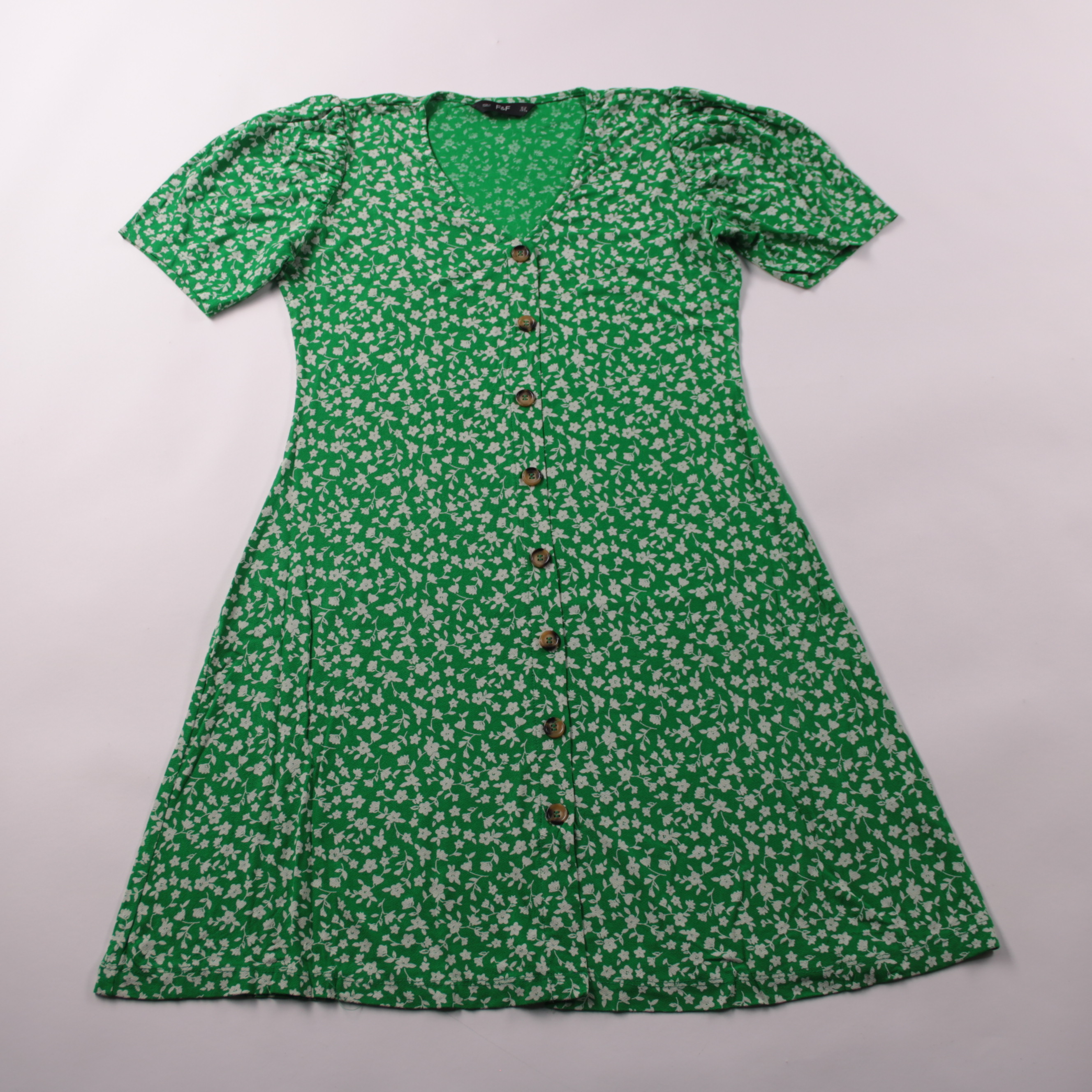 Повседневное платье F&F зелёного цвета с мелким белым цветочным принтом, V-образным вырезом и застёжкой на пуговицы по всей длине. Подойдёт для лета, прогулок и отпуска благодаря лёгкой ткани и коротким рукавам-фонарикам. Пуговицы спереди позволяют удо...