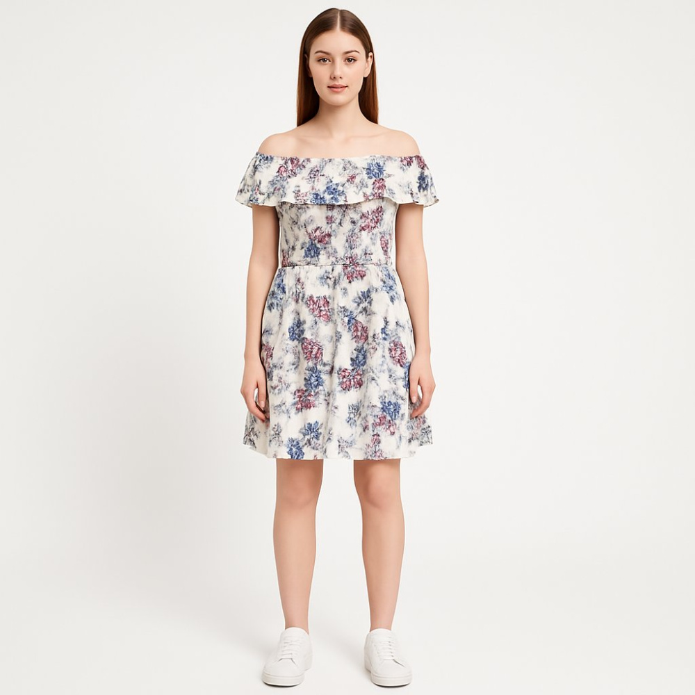 Летнее платье с открытыми плечами и цветочным принтом на светлой основе. Подойдёт для прогулок и повседневных выходов в тёплую погоду, можно носить с кедами или босоножками. Лёгкая ткань и свободная юбка комфортны в течение дня.