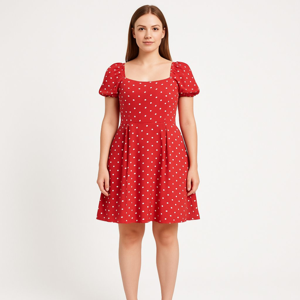 Повседневное платье Shein Curve красного цвета в белый горох, с квадратным вырезом и рукавами-фонариками. Подойдёт для прогулок, отпуска и встреч в тёплую погоду. Лёгкий полиэстер быстро сохнет и почти не мнётся.