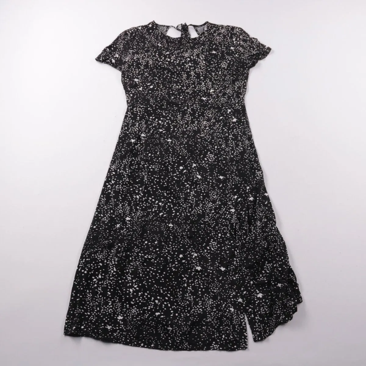Повседневное платье 24Colours из вискозы, чёрного цвета с белым крапом и коротким рукавом. Подойдёт для тёплой погоды и на каждый день, легко сочетается с кедами или сандалиями. Ткань лёгкая и дышащая, поэтому комфортно носить в жару.