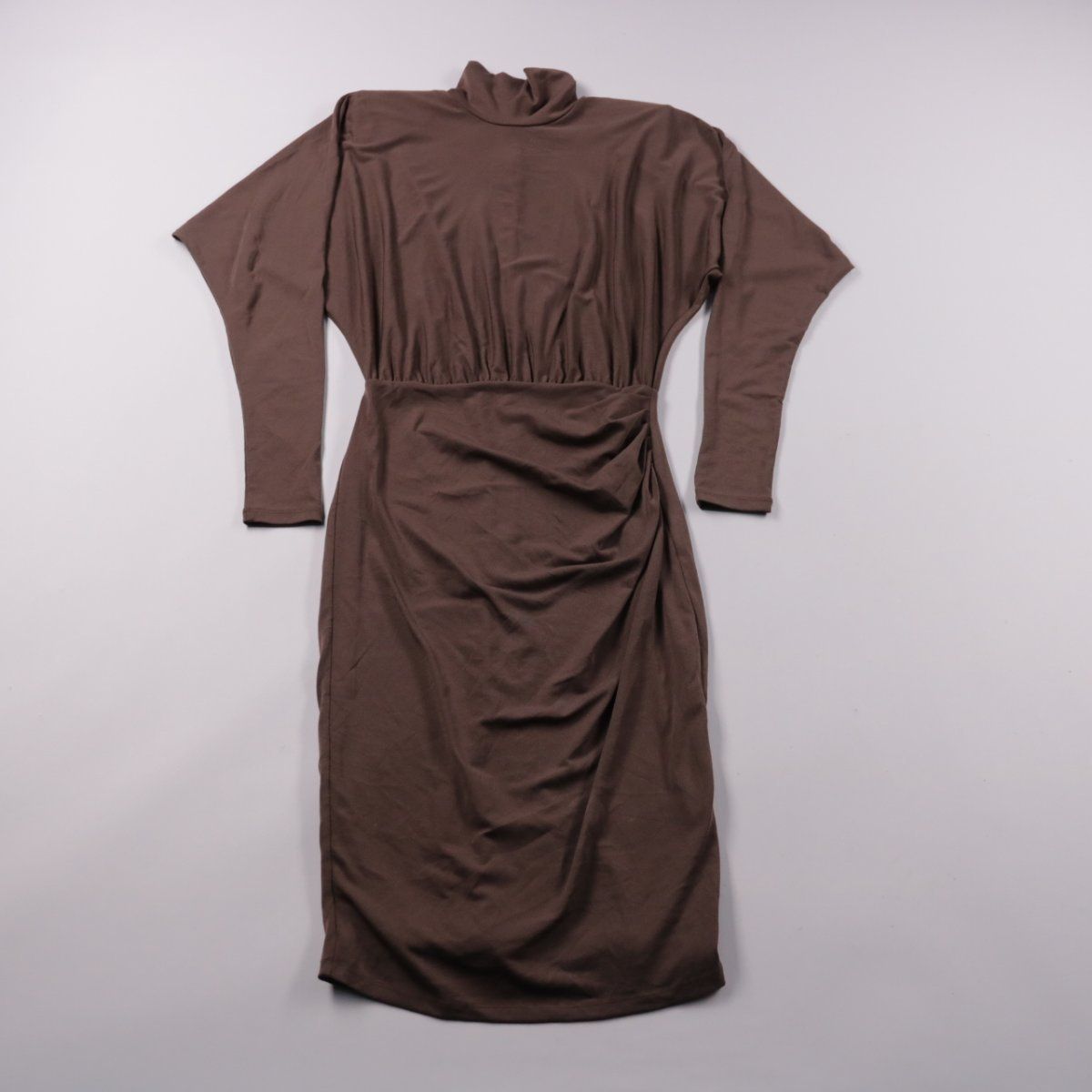 Женское повседневное платье не указанного бренда в коричневом цвете с высоким воротником и длинным рукавом. Мягкий эластичный трикотаж и драпировка по талии делают силуэт аккуратным и комфортным для офиса или на каждый день. Материал почти не мнётся и хорошо тянется, поэтому удобно носить в течение дня.
