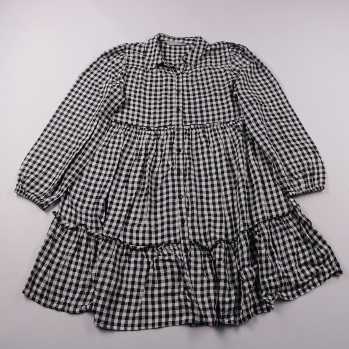 Повседневное платье George Maternity в чёрно-белую клетку с ярусной юбкой, отложным воротником и длинными рукавами. Подойдёт для повседневной носки, прогулок и офиса в демисезон и прохладное лето. Свободный крой не сковывает движения и удобен во время беременности.