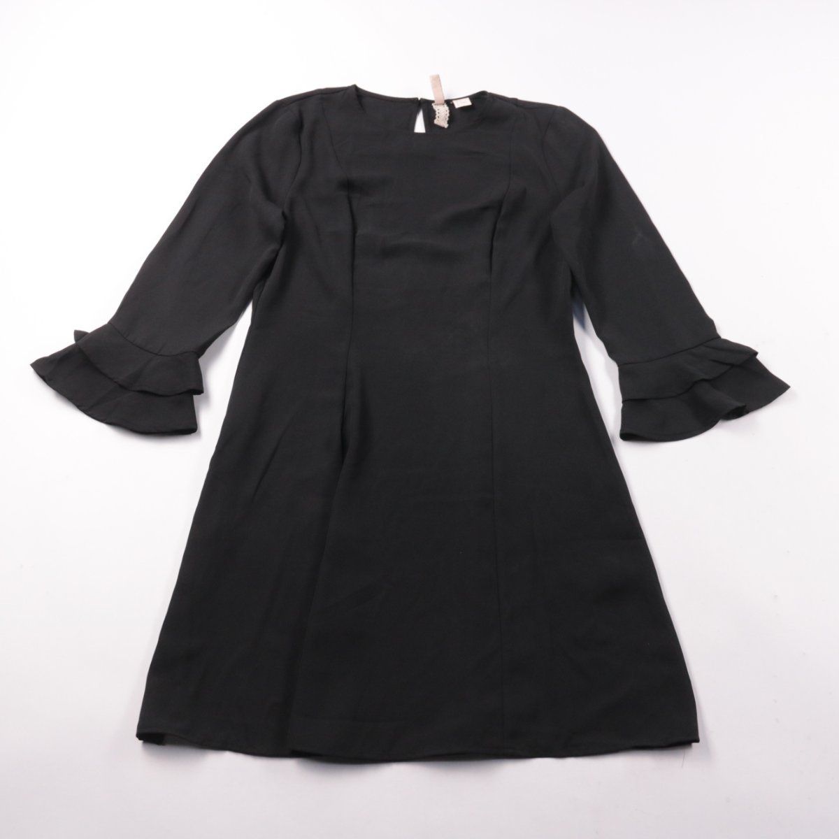 Платье Divided (H&M) чёрного цвета, свободного А-силуэта, с рукавами 3/4 и воланами на манжетах. Подойдёт для офиса, повседневных выходов и лаконичных вечерних образов благодаря однотонному дизайну и аккуратному вырезу-капле сзади. Практичный плюс — ткань из полиэстера меньше мнётся и проще в уходе.