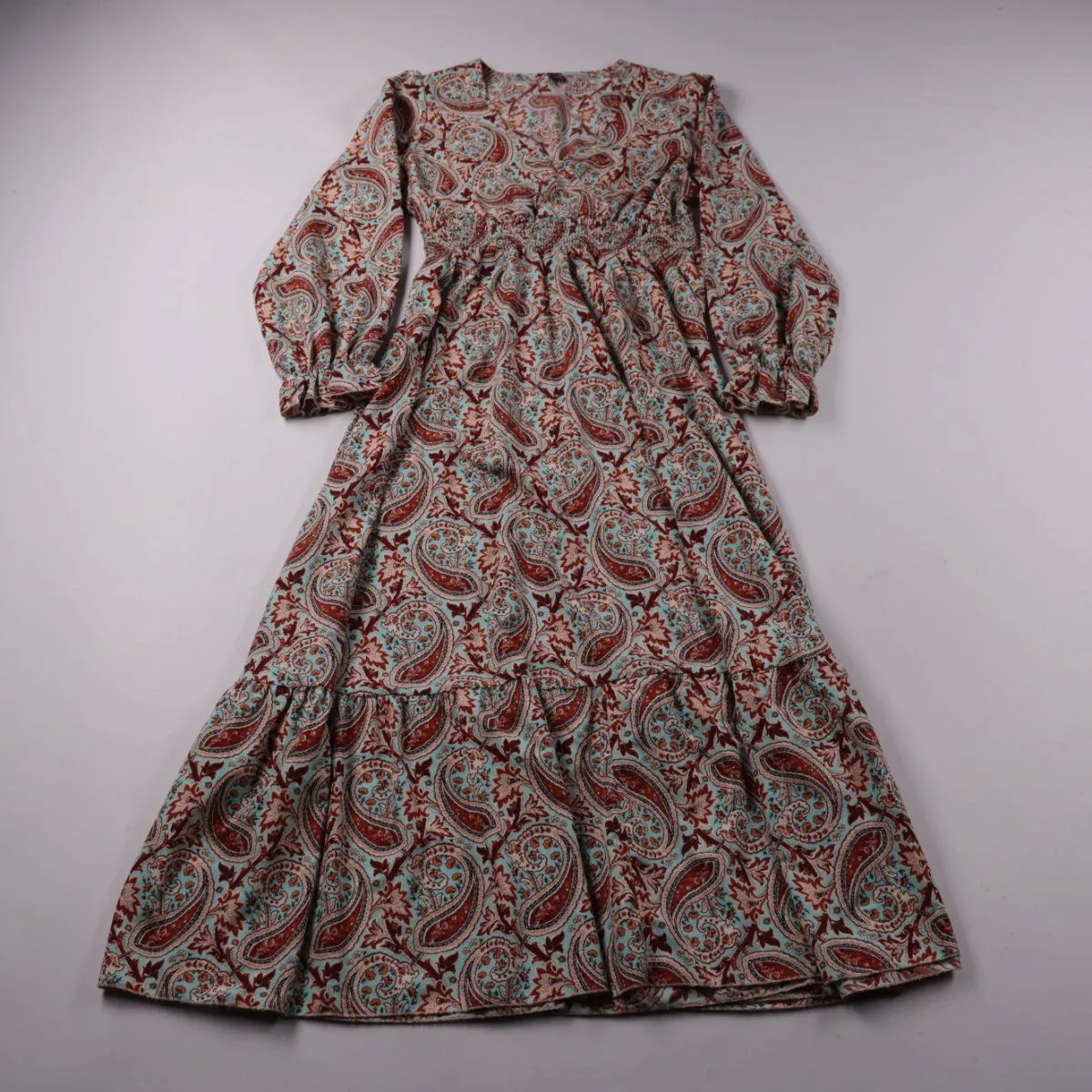Повседневное платье SHEIN длины миди/макси с принтом пейсли и длинными рукавами на резинке. Подойдёт для прогулок и повседневных образов благодаря эластичной линии талии и свободной юбке. Практично тем, что ткань с добавлением эластана слегка тянется и легко стирается в машине.