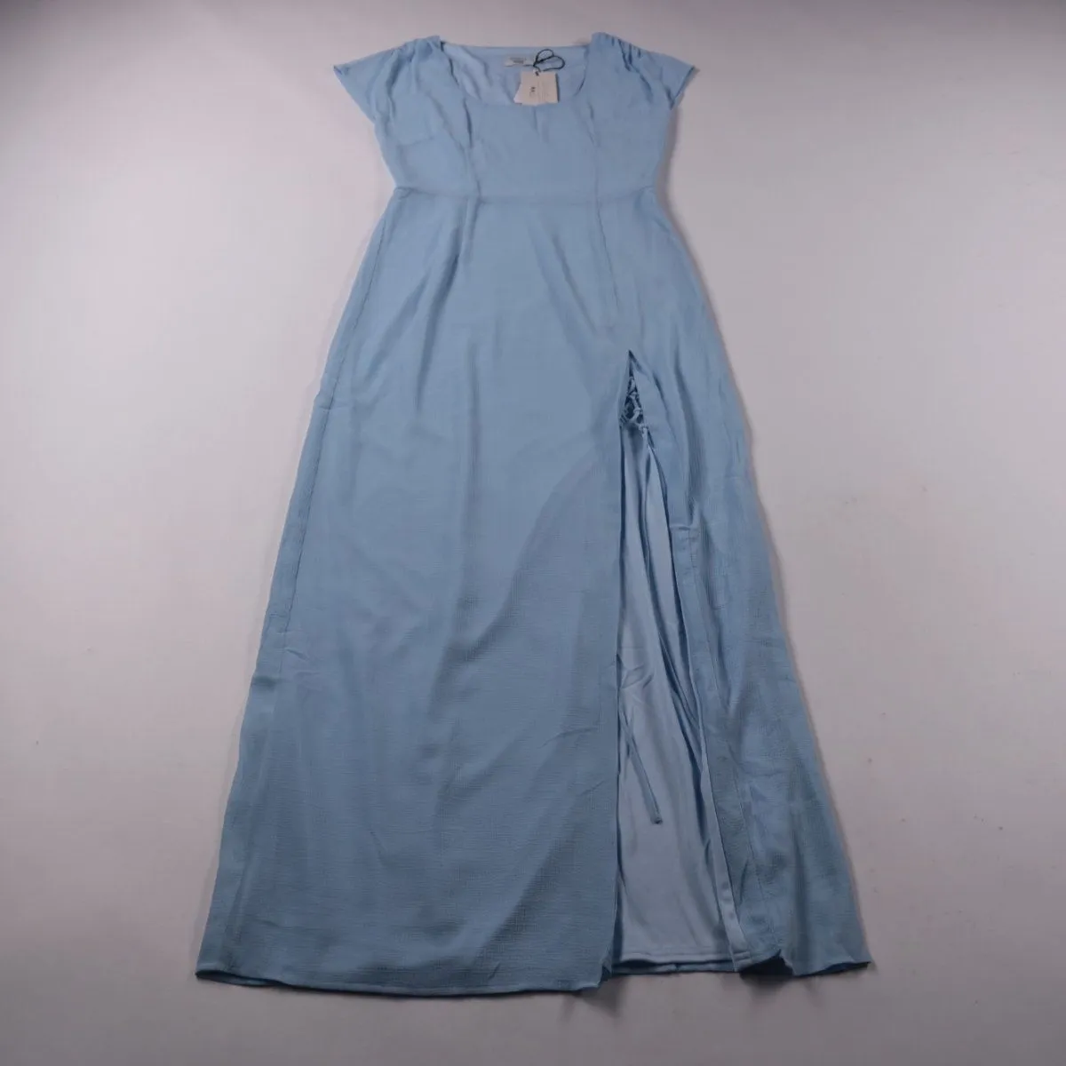 Длинное голубое платье PAMELA x NA-KD с коротким рукавом-крылышком и завышенной линией талии. Подойдёт для повседневных летних образов и отдыха, есть разрез сбоку для удобства шага. Практично тем, что лёгкая ткань из полиэстера проста в уходе и быстро сохнет.