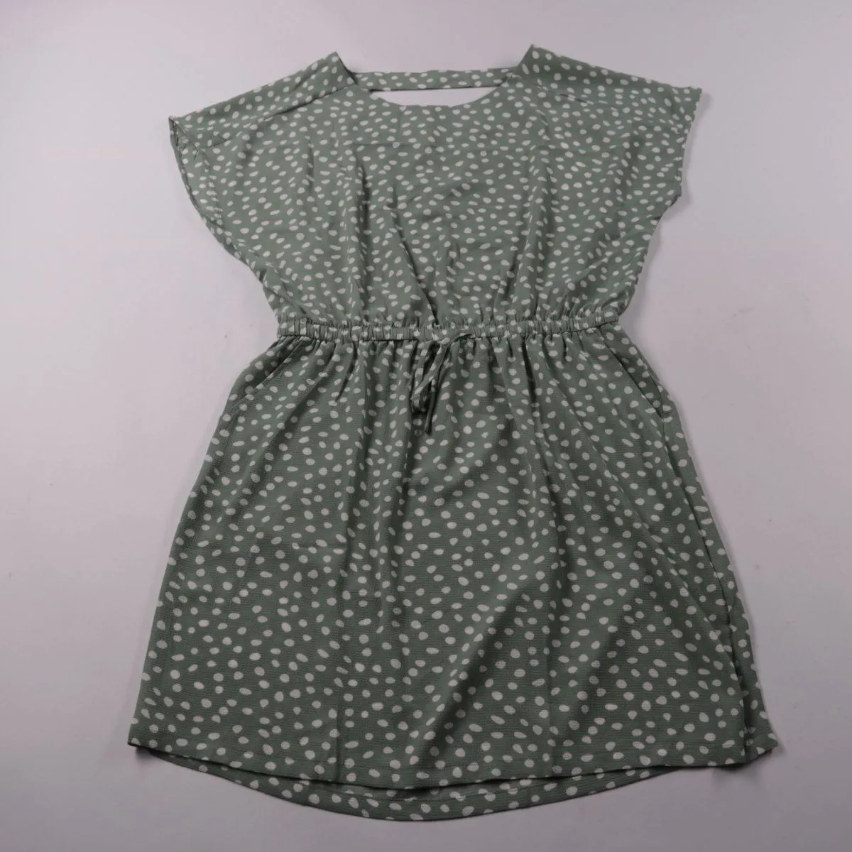 Повседневное платье ONLY в зелёном цвете с белым горошком, с коротким рукавом и округлым вырезом. Талия на резинке с завязками, поэтому модель удобно садится и подходит для прогулок и на каждый день. Лёгкая ткань быстро сохнет и проста в уходе.
