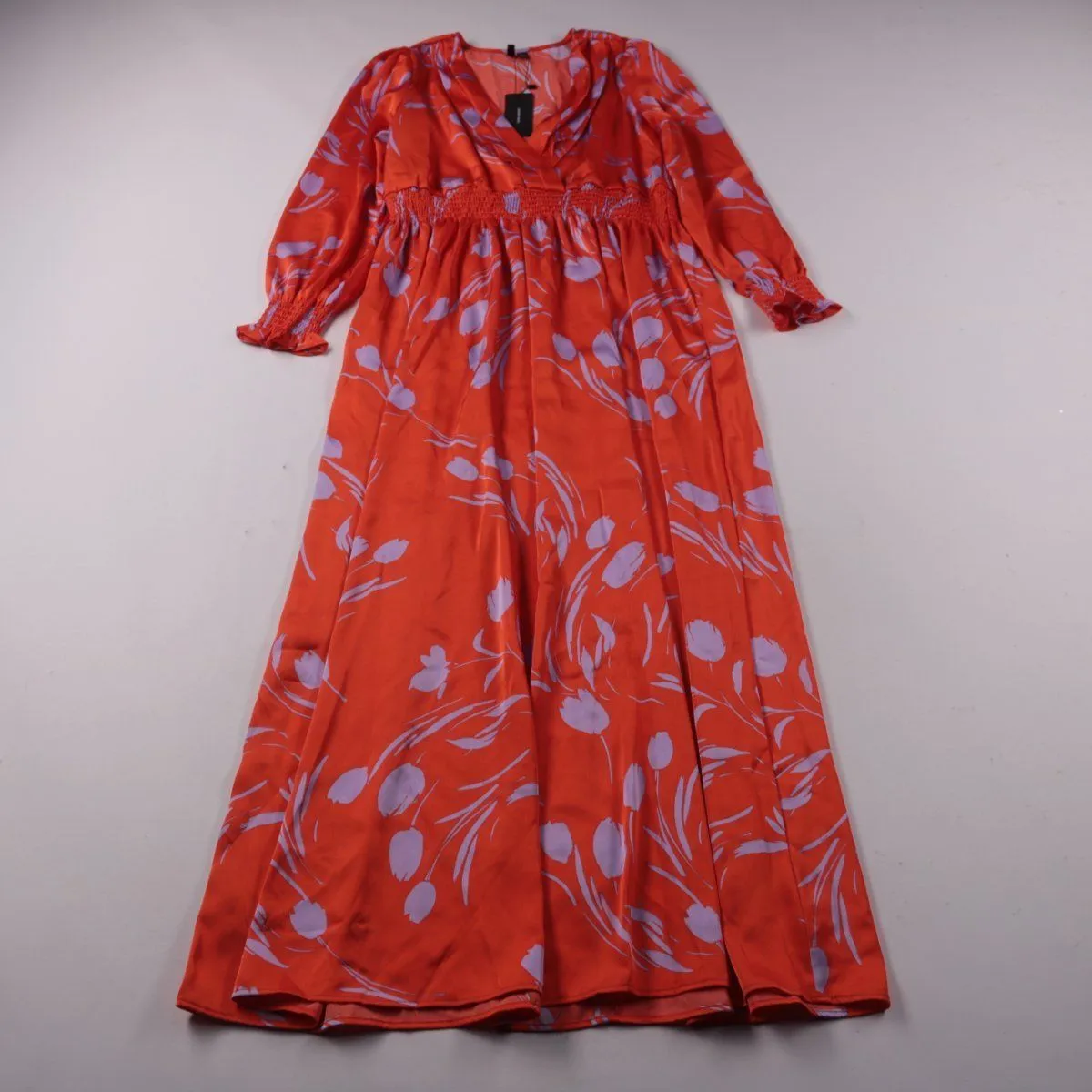 Повседневное длинное платье Vero Moda с V-образным вырезом и рукавами 3/4 на резинке. Оранжевый фон с лиловым цветочным принтом и присборенной эластичной талией подойдёт для прогулок и повседневных образов. Лёгкий полиэстер почти не мнётся и быстро сохнет.