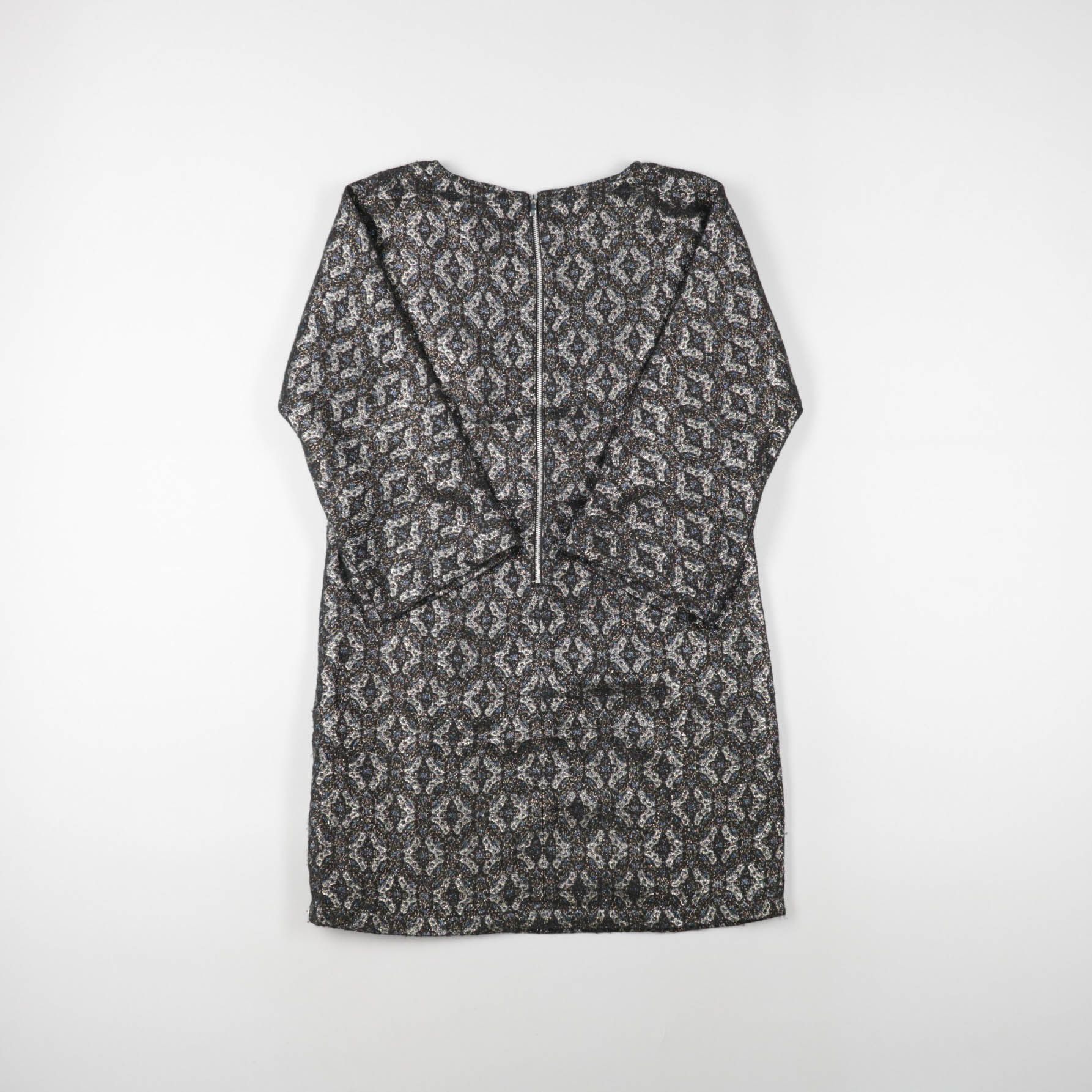 Короткое платье с длинным рукавом и застёжкой-молнией по спинке, ткань с жаккардовым узором в чёрно‑серебристых тонах. Подойдёт для вечернего выхода или мероприятия, когда нужен нарядный, но сдержанный образ. Молния сзади удобна для быстрого надевания ...