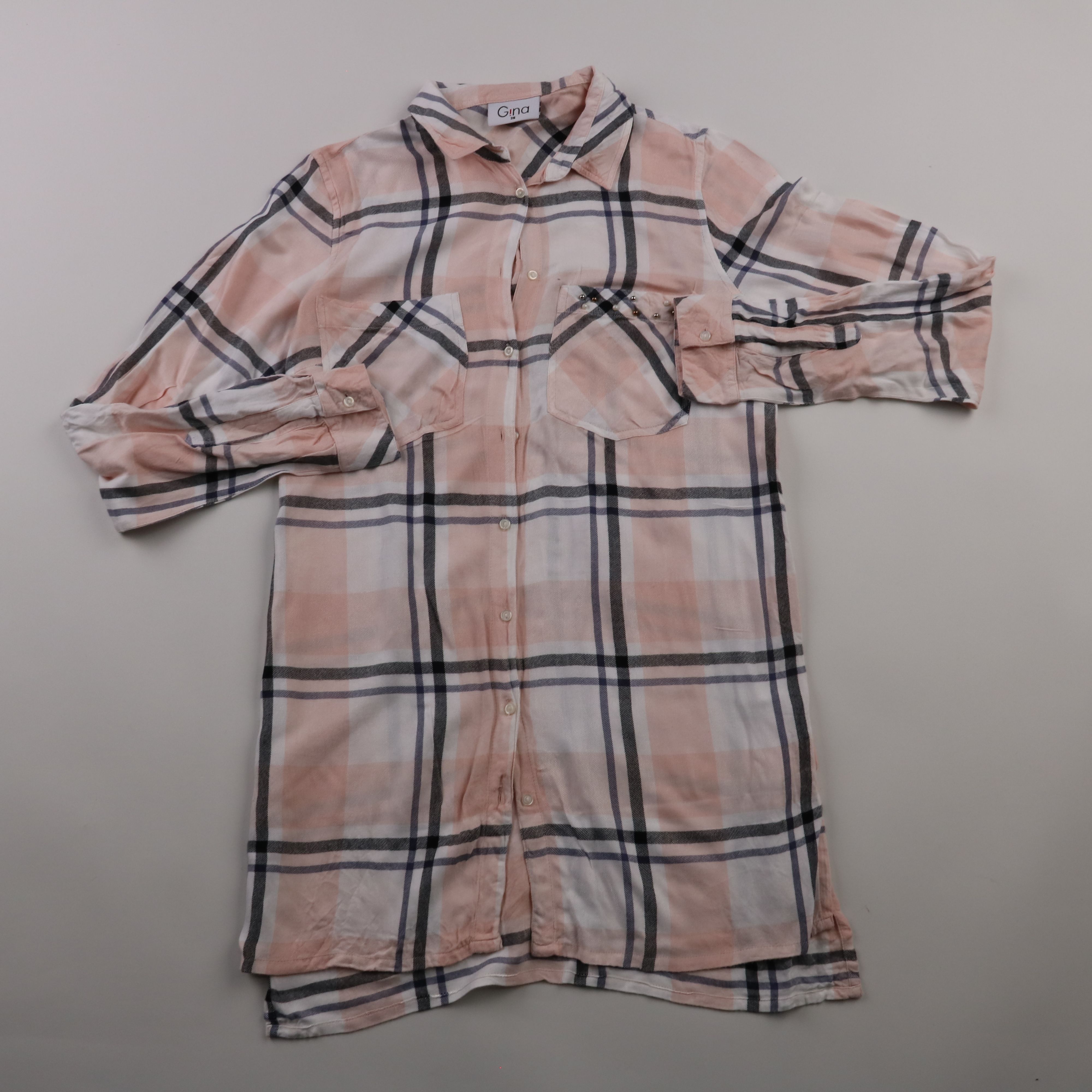 Рубашка Gina в розово-белую клетку, свободного кроя, на пуговицах и с накладными карманами. Подойдёт для повседневных образов и в офис с базовыми джинсами или брюками. Вискоза приятна к телу и хорошо дышит.
